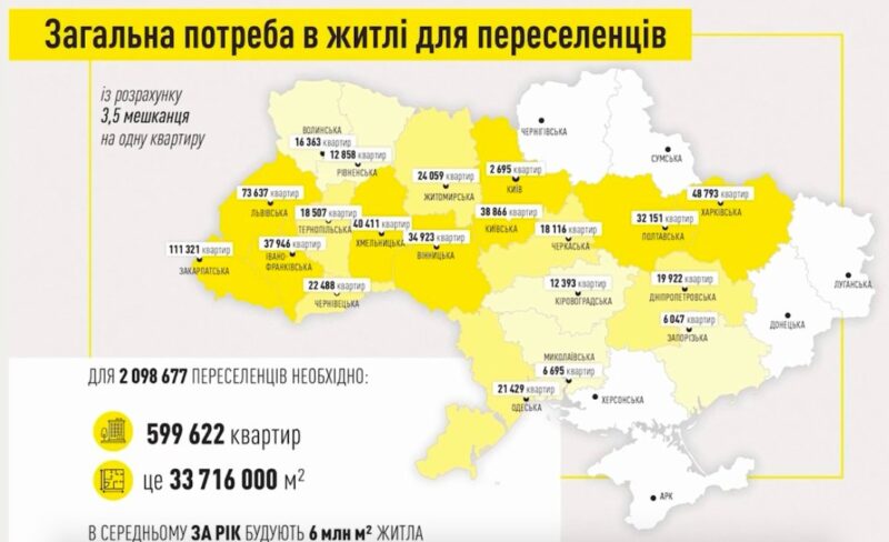 Тим часом, щоб забезпечити переселенців житлом, знадобиться щонайменше 600 тисяч квартир — це підрахунки Кирила Тимошенка, який презентував ще восени 2022 року Fast Recovery Plan. Той же Тимошенко оптимістично рапортував, що перші 2000 квартир буде збудовано за 5–6 місяців, і ВПО зможуть жити в них так довго, поки їхні рідні міста не будуть відновлені, після чого житло, що звільнилося, передадуть військовим і медикам. Але з критерієм Fast уже не склалося. Фактично всюди процес загальмувався на рівні оформлення документації на землевідведення та проєкти.