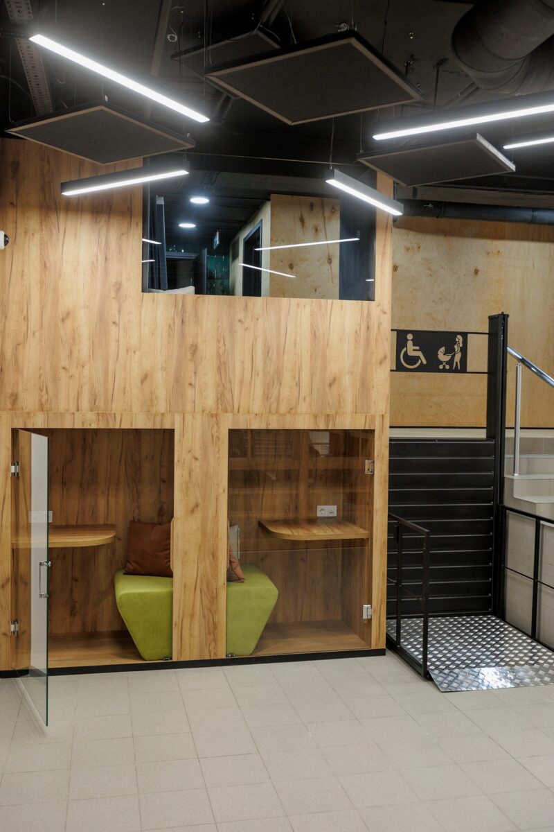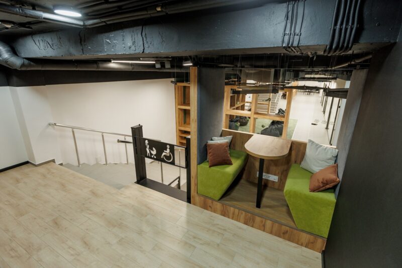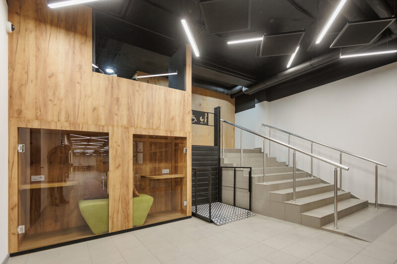 Другою важливою перевагою приміщення, вважає архітектор, є його продуманість: кімнати із зонами відпочинку та капсули, де викладачі можуть проводити онлайн-лекції, мають добру звукоізоляцію, а відкриті простори зоновані шафами для книг. Щодо інклюзивності, то CLUST SPACE у ДНУ облаштований так, аби людина з інвалідністю легко змогла потрапити до будь-якої зони чи кімнати, зокрема до локацій на другому рівні.
