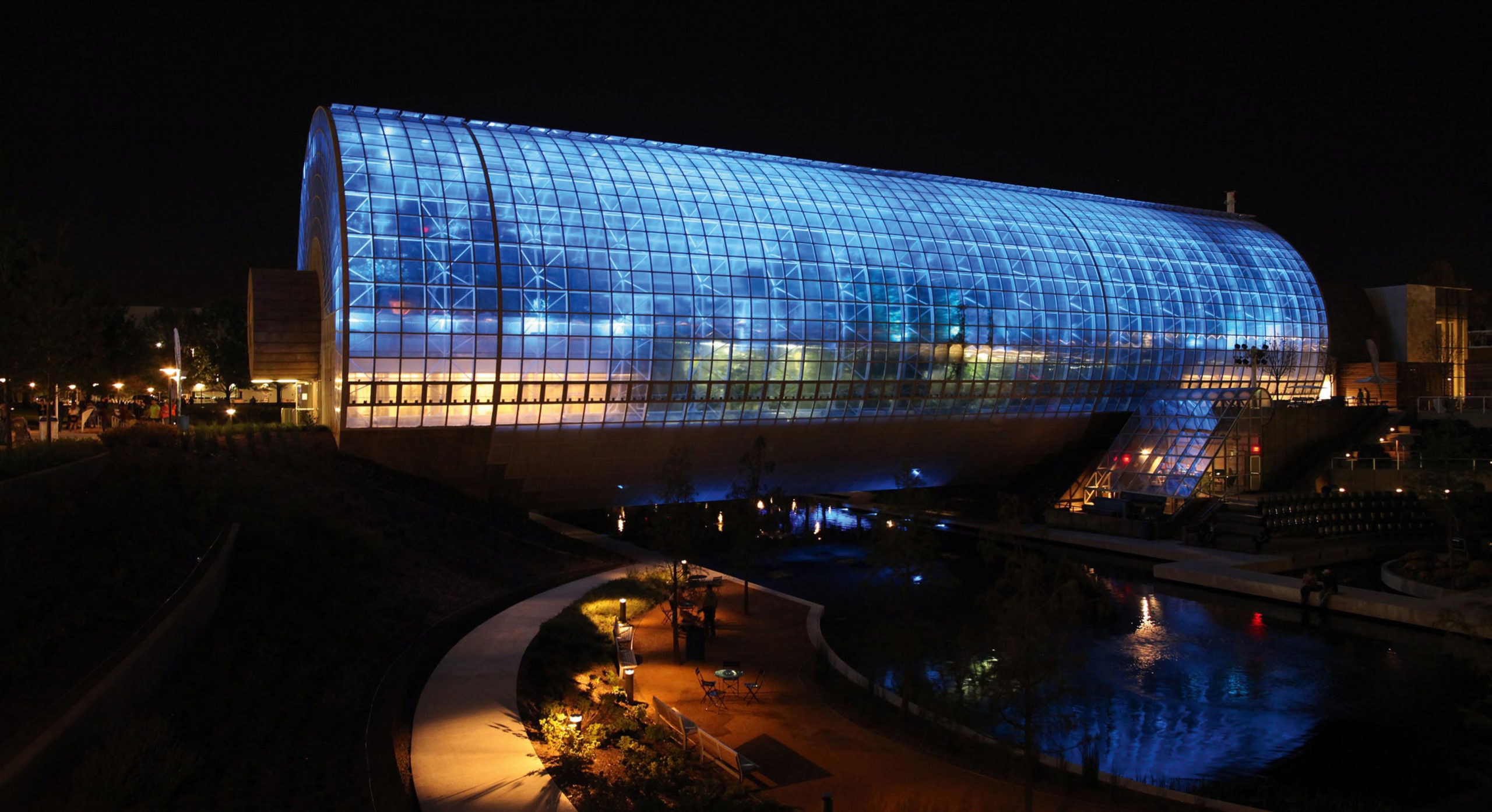 Уникальный мост-оранжерея Crystal Bridge Tropical Conservatory сам по себе был достопримечательностью ботанического сада в Оклахоме. Архитектор Бэй Юймин в конце 60‑х спроектировал оранжерею в виде трубы длиной в 70 м, которая одновременно служит мостом над озером. В 2011 г. оранжерею реконструировали, заменив морально устаревшие и неэкономичные металлогалогенные прожекторы LED-cветильниками. Они не греются и выдерживают экстремальную влажность — внутри оранжереи постоянно работают испарители, обеспечивающие комфортный микроклимат для растений. Новая система интеллектуального освещения дает администрации ботанического сада возможность создать романтическую атмосферу пространства, которое часто используется для торжеств и свадеб, еще более волшебной.