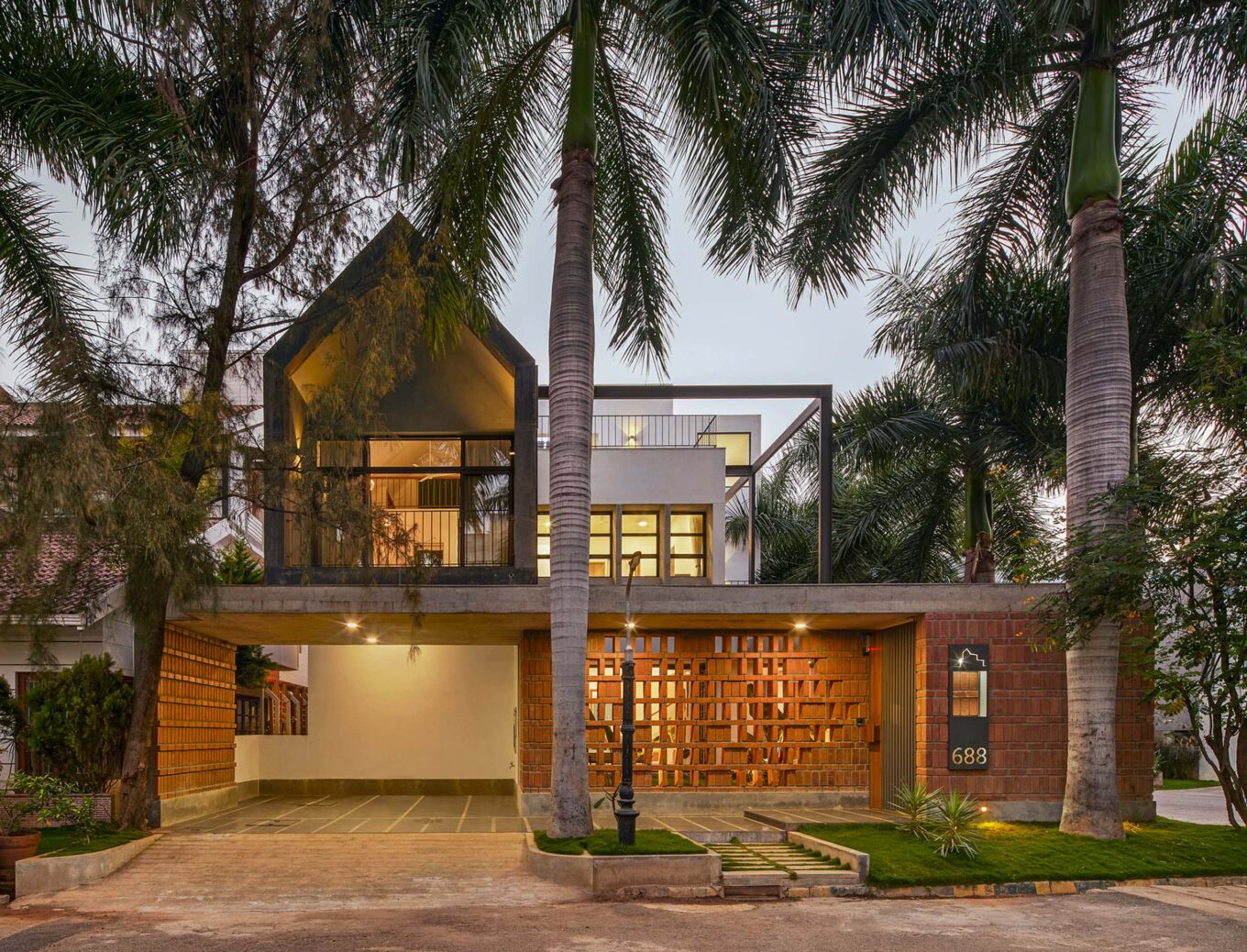 В доме есть спальни для пожилых родителей, кабинет, детская спальня и главная, гостиная, столовая и комната для пуджи. Детская спальня на первом этаже выступает из основной массы здания и увенчана скатной крышей, облицованной серым гранитом, с небольшим чердаком над ванной.