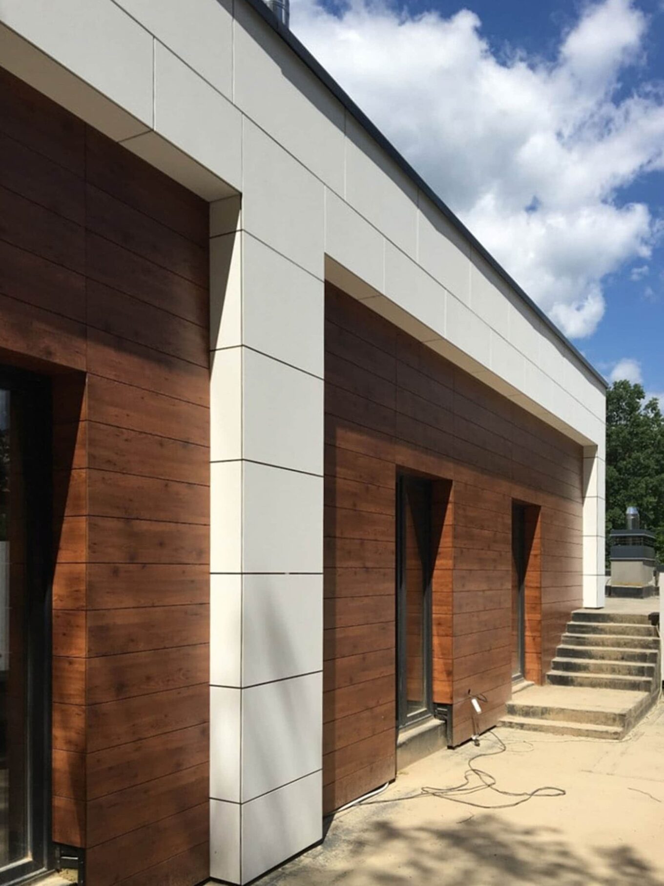 Вторым не менее важным фасадным материалом мы выбрали HPL панели, так как это единственный аналог дерева, но более практичный, долговечный и не требующий постоянного тщательного ухода. HPL панели от Fundermax не только практичны, а и эстетичны. При этом цветовая гамма материала позволяет создавать гармоничные и функциональные объекты, которые останутся в тренде на многие годы.