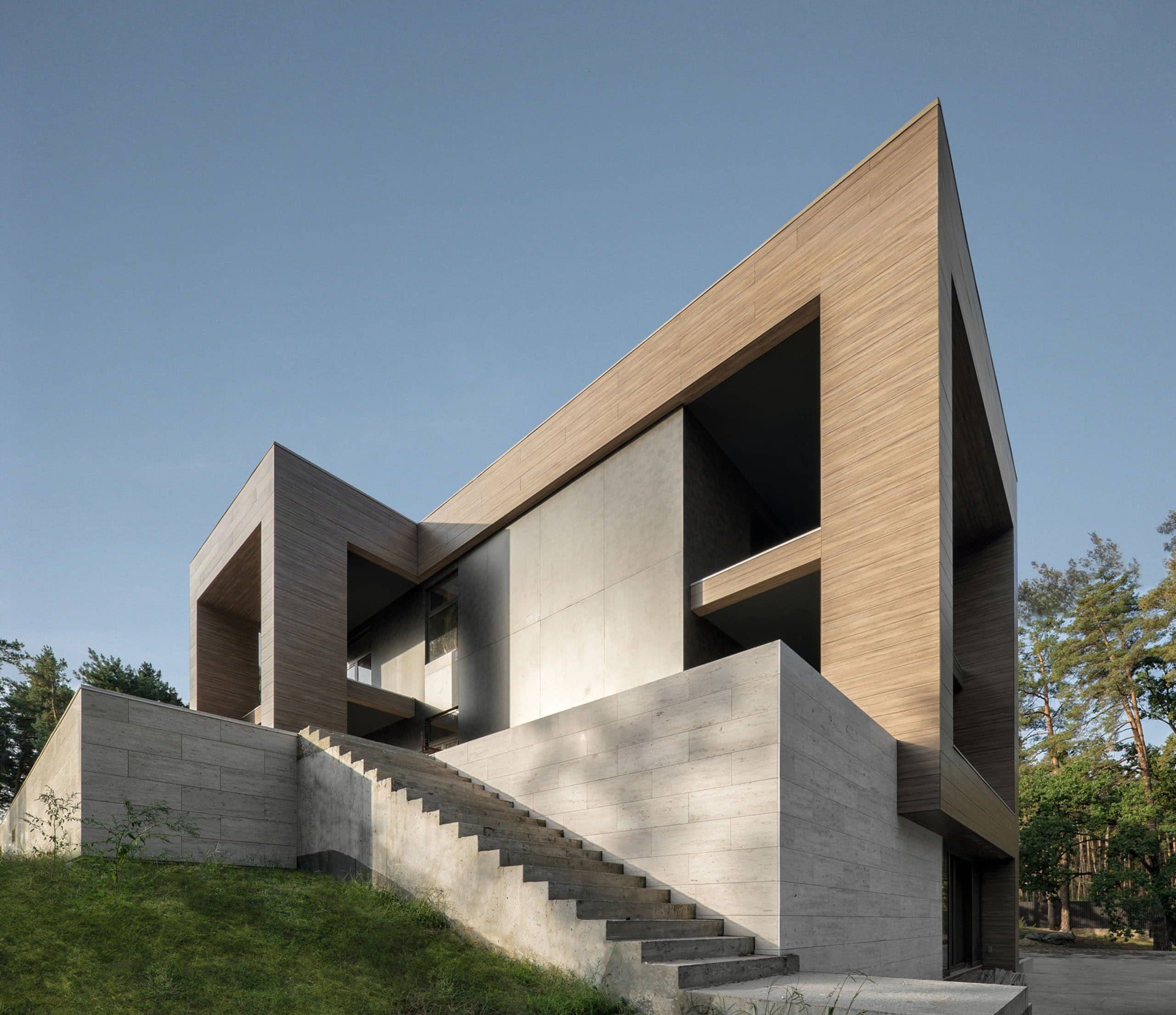 Частный дом в с. Лесники Киевской обл. Архитектор — Виктория Алехина. На фасадах — HPL панели Fundermax, реализация монтажа — компания «Фасадные системы»