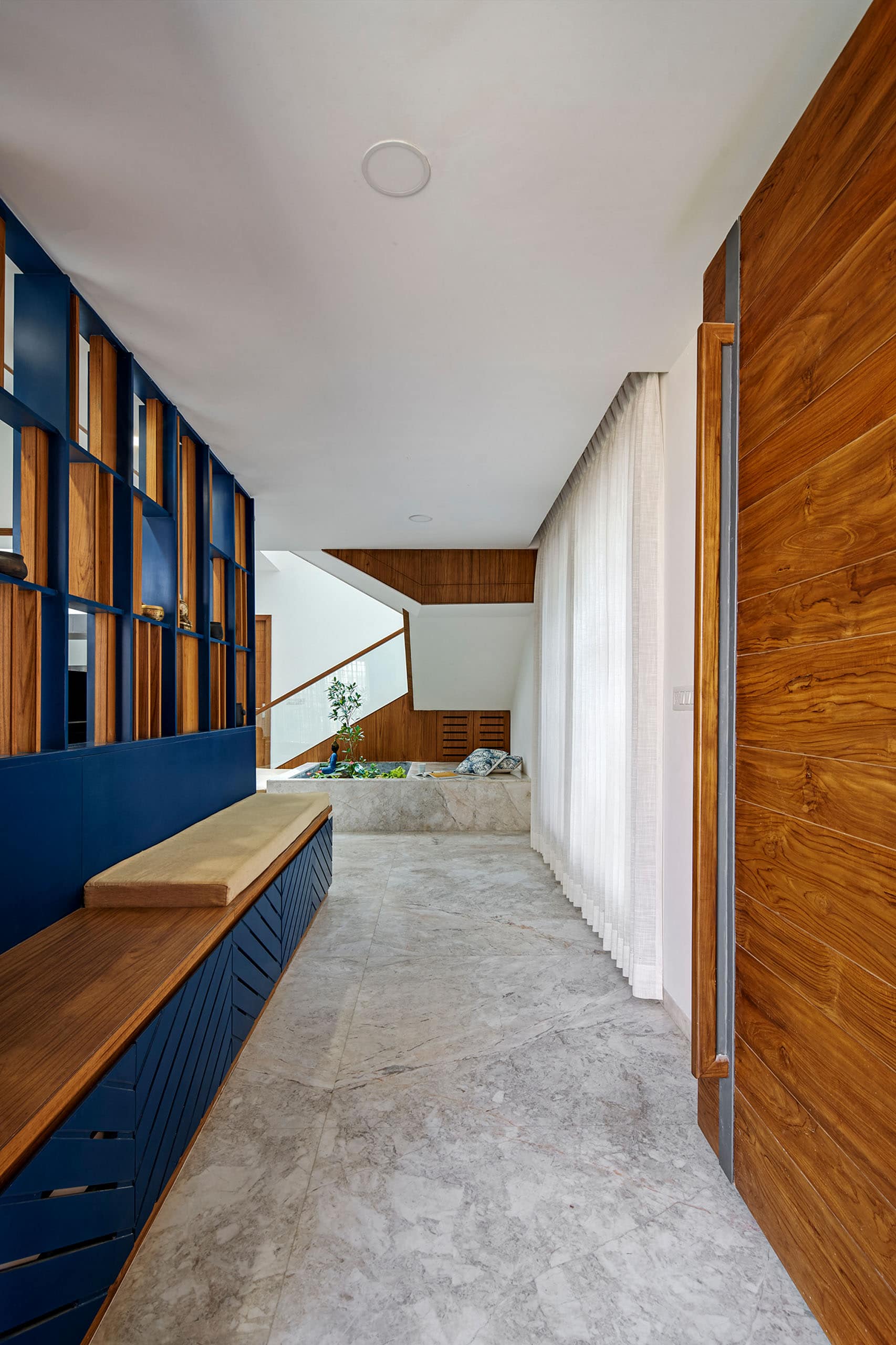 В доме есть спальни для пожилых родителей, кабинет, детская спальня и главная, гостиная, столовая и комната для пуджи. Детская спальня на первом этаже выступает из основной массы здания и увенчана скатной крышей, облицованной серым гранитом, с небольшим чердаком над ванной.