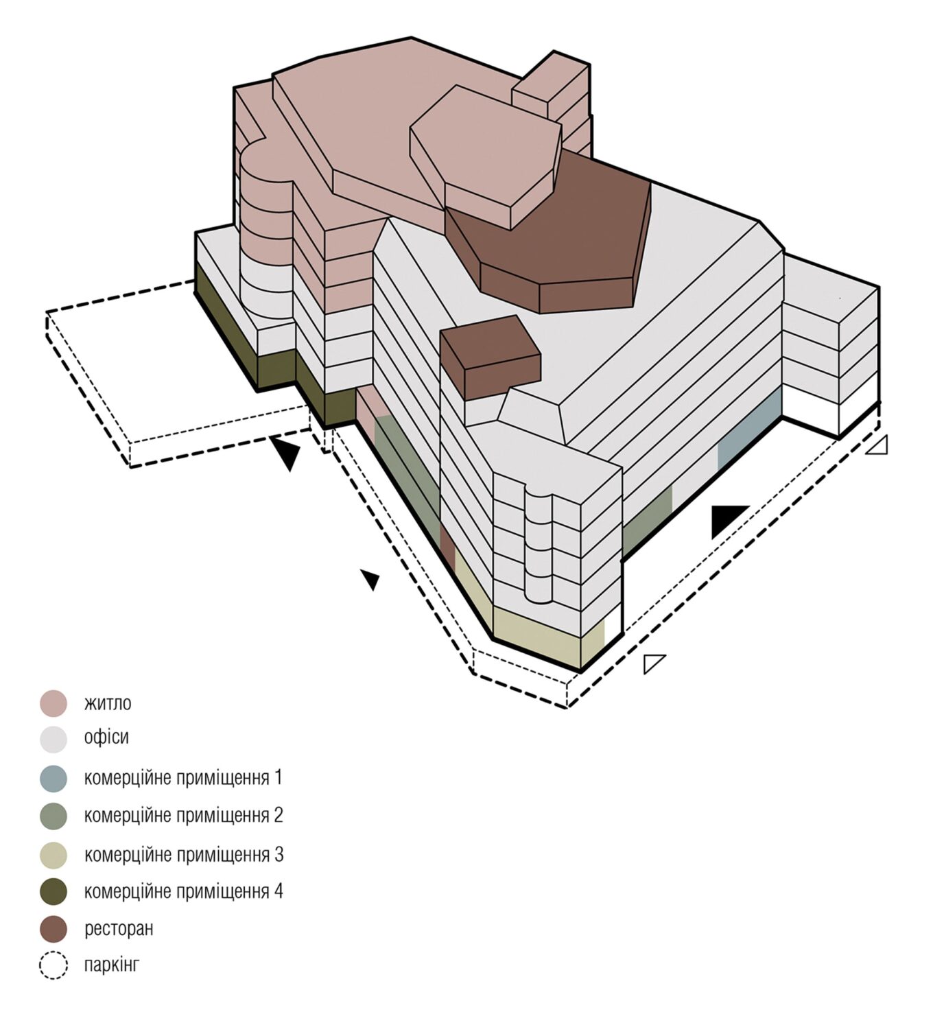 Схема функціонального розподілу комерційних, житлових і громадських площ об’єкта реконструкції. Джерело зображення: BURØ architects