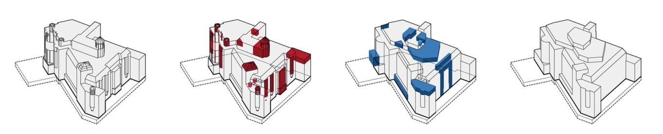 Етапи архітектурного «огранювання» об’єкта: вихідний об’єм, демонтаж, монтаж, новий об’єм. Джерело зображення: BURØ architects