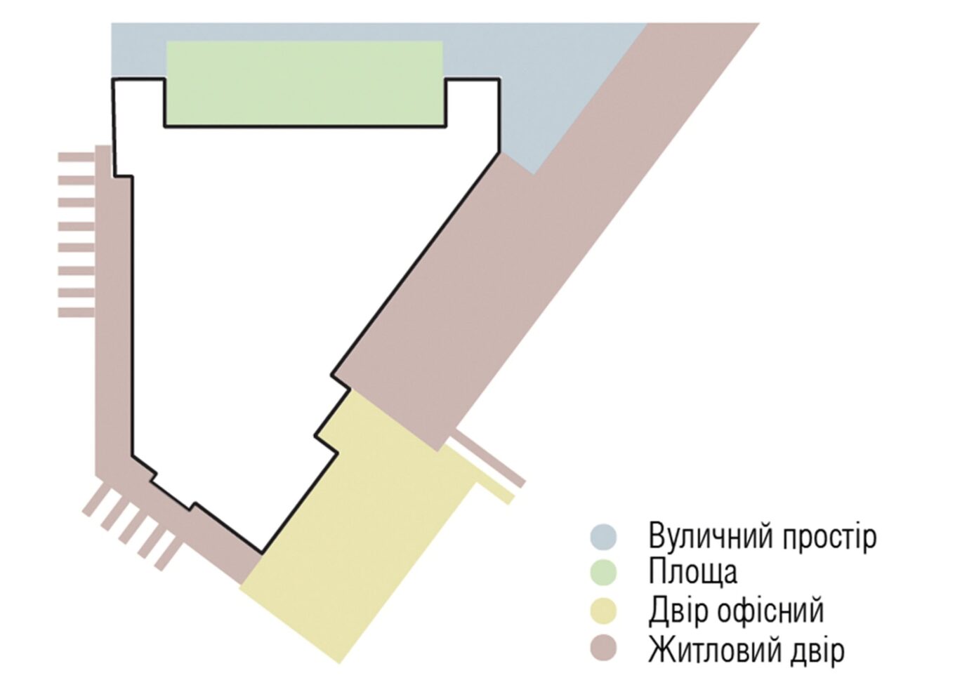 Олексій Пахомов: «На тій документації, що мені передали, було вказане прізвище архітектора, яке нічого мені не говорило. Хоча сам ребус достатньо простий. Дивна форма будівлі в плані зумовлена бажанням максимально використати площу ділянки. Судячи з початкового проєкту, фасад планувалося вивести нарівно з Андріївською вулицею, впритул до червоної лінії. Та по факту, якщо звернете увагу, там навіть з’явився невеликий курдонер — щоправда, майже символічний. Наскільки я розумію, на якійсь міськраді проєктувальників попросили відступити, і в підсумку утворилася невелика площа перед входом.