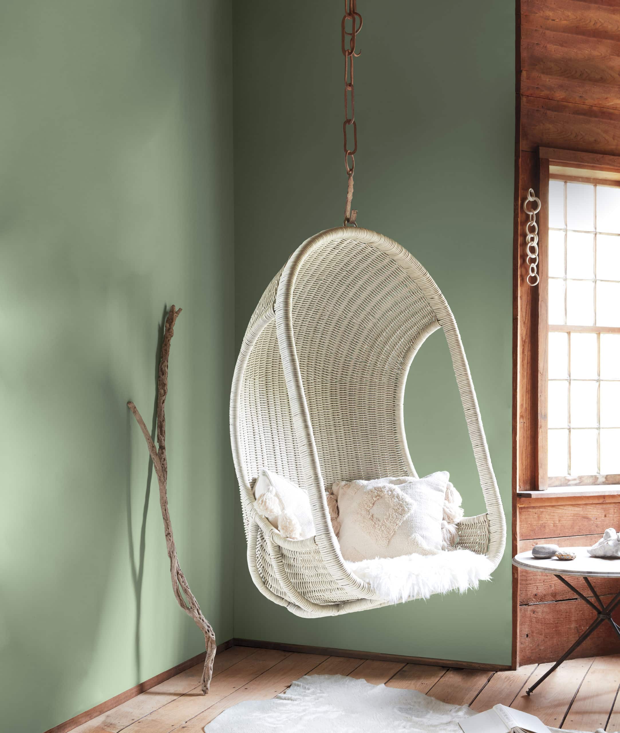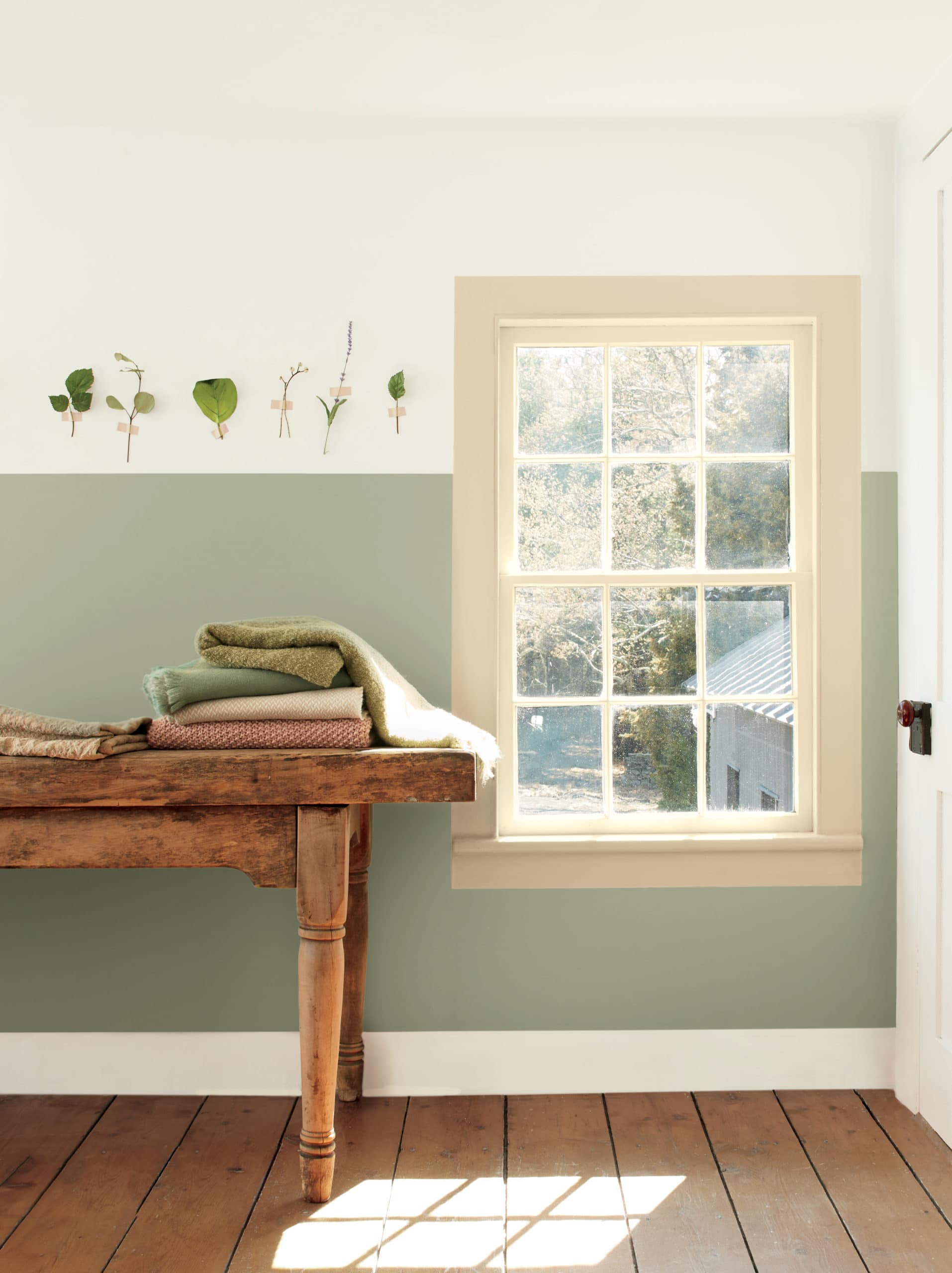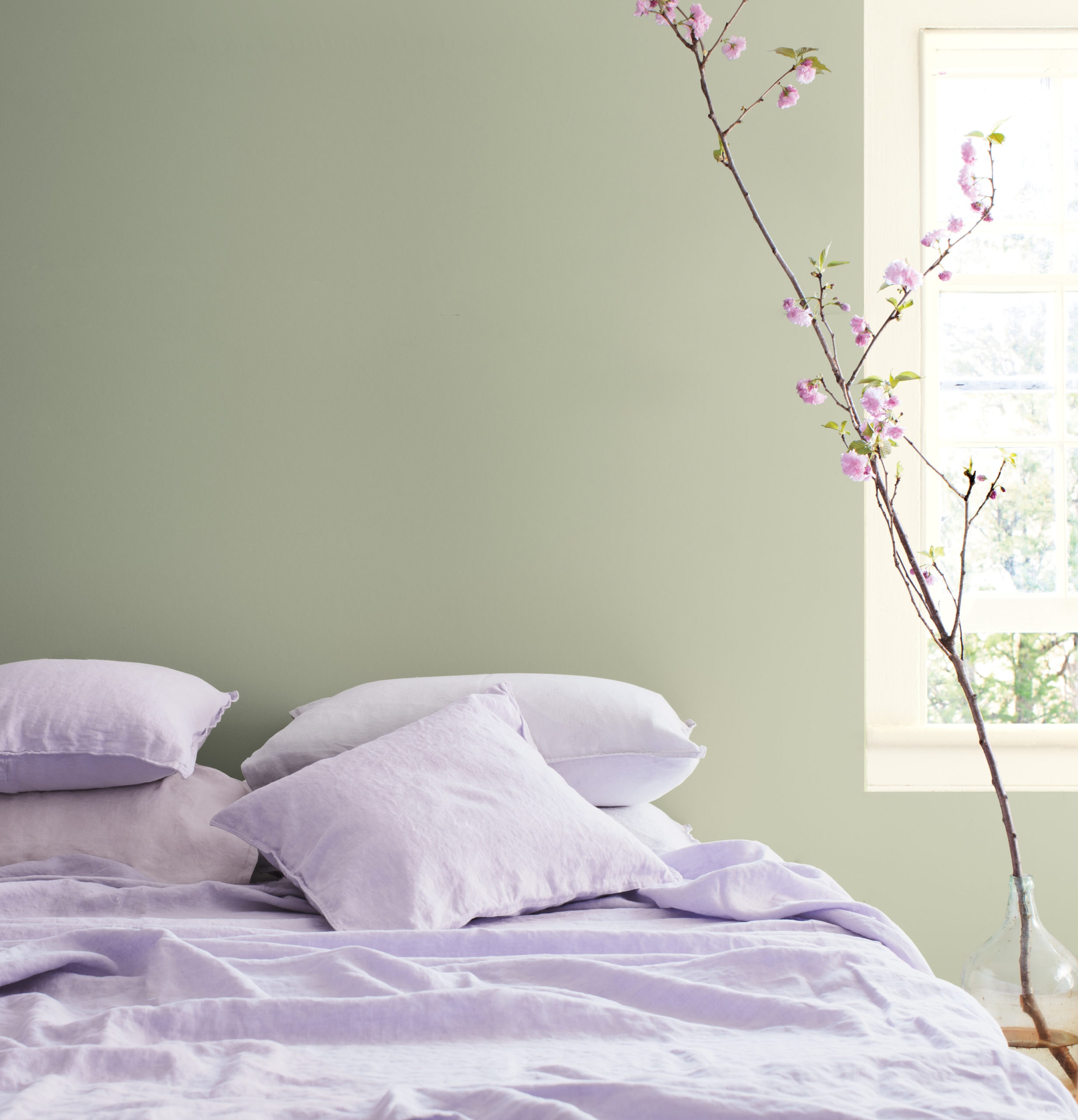Приглушенный оттенок October Mist 1495 создает в интерьере атмосферу легкости и никак не конфликтует с индивидуально подобранным декором