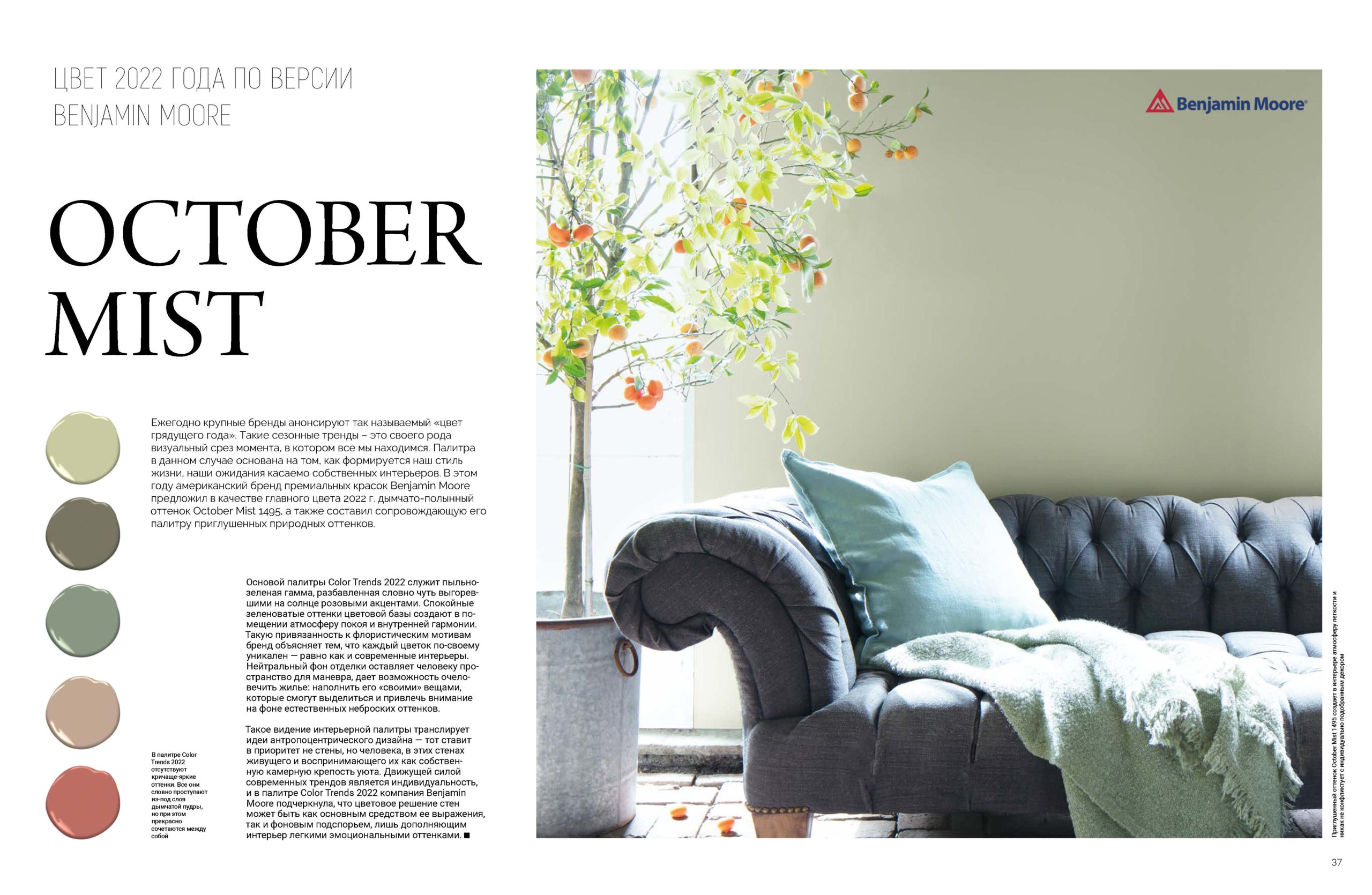 В этом году американский бренд премиальных красок Benjamin Moore предложил в качестве главного цвета 2022 года дымчато-полынный оттенок October Mist 1495, а также составил сопровождающую его палитру приглушенных природных оттенков.