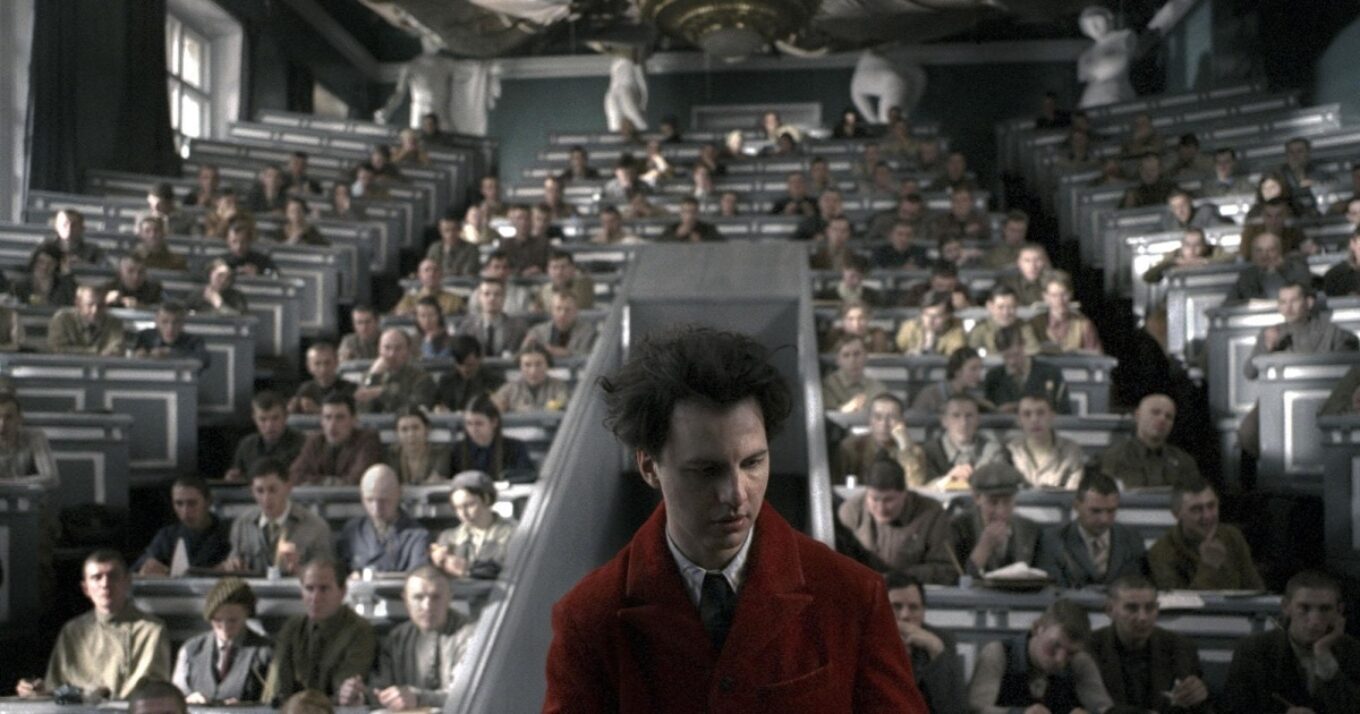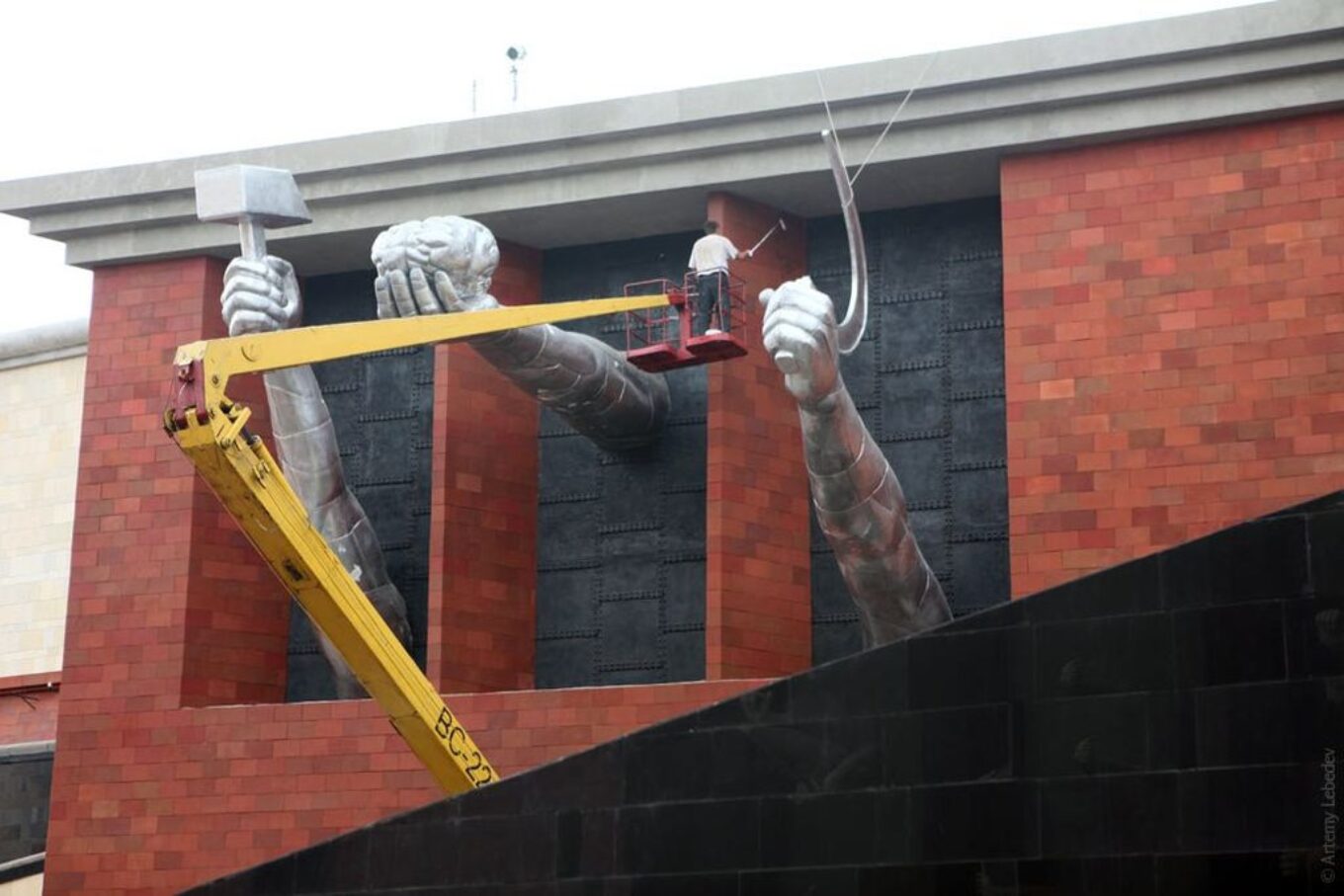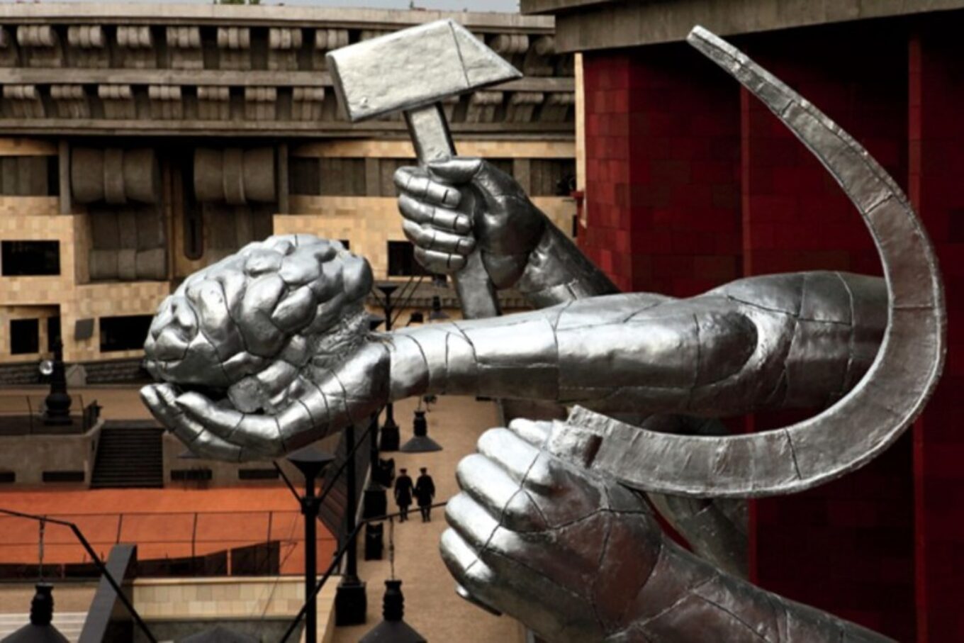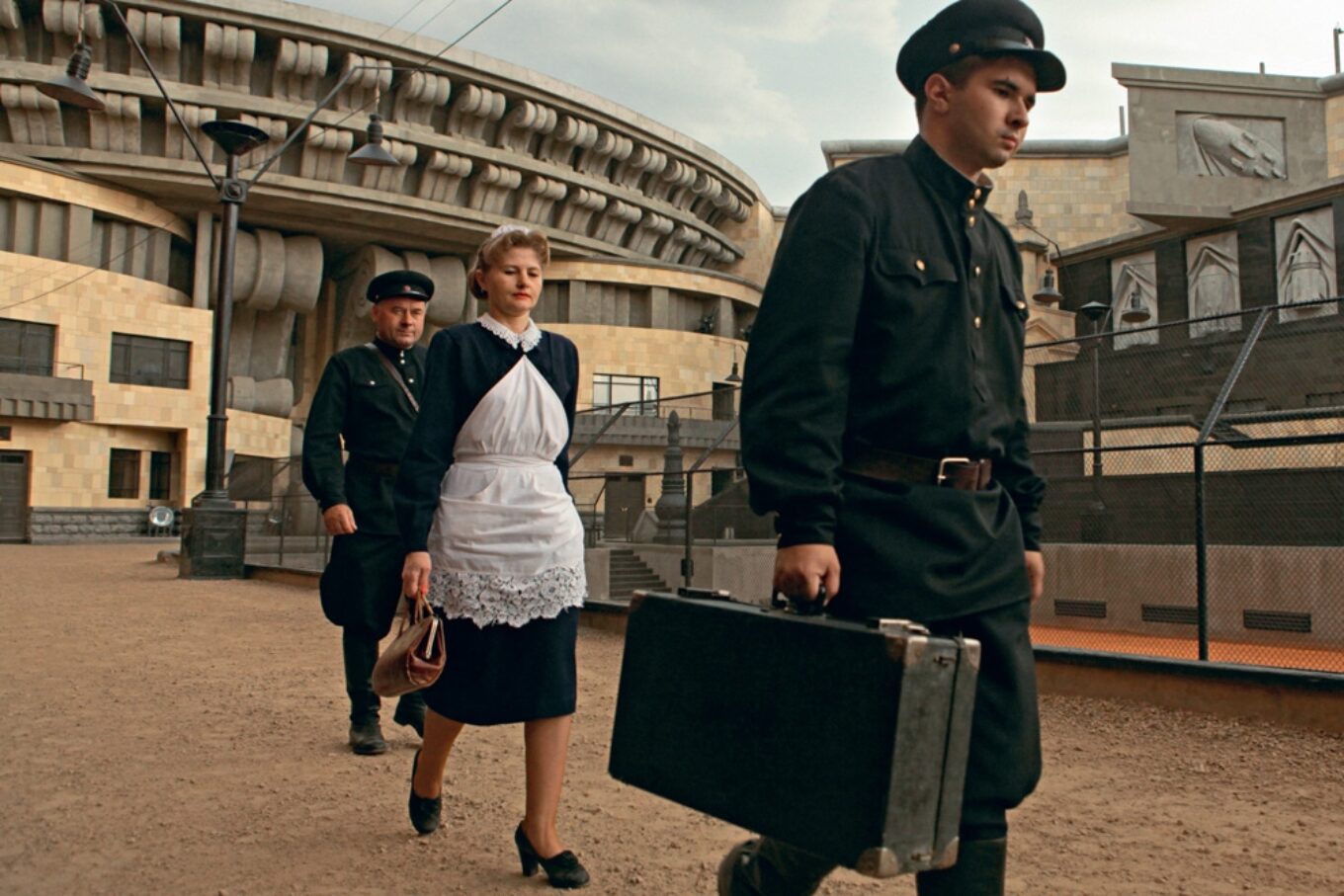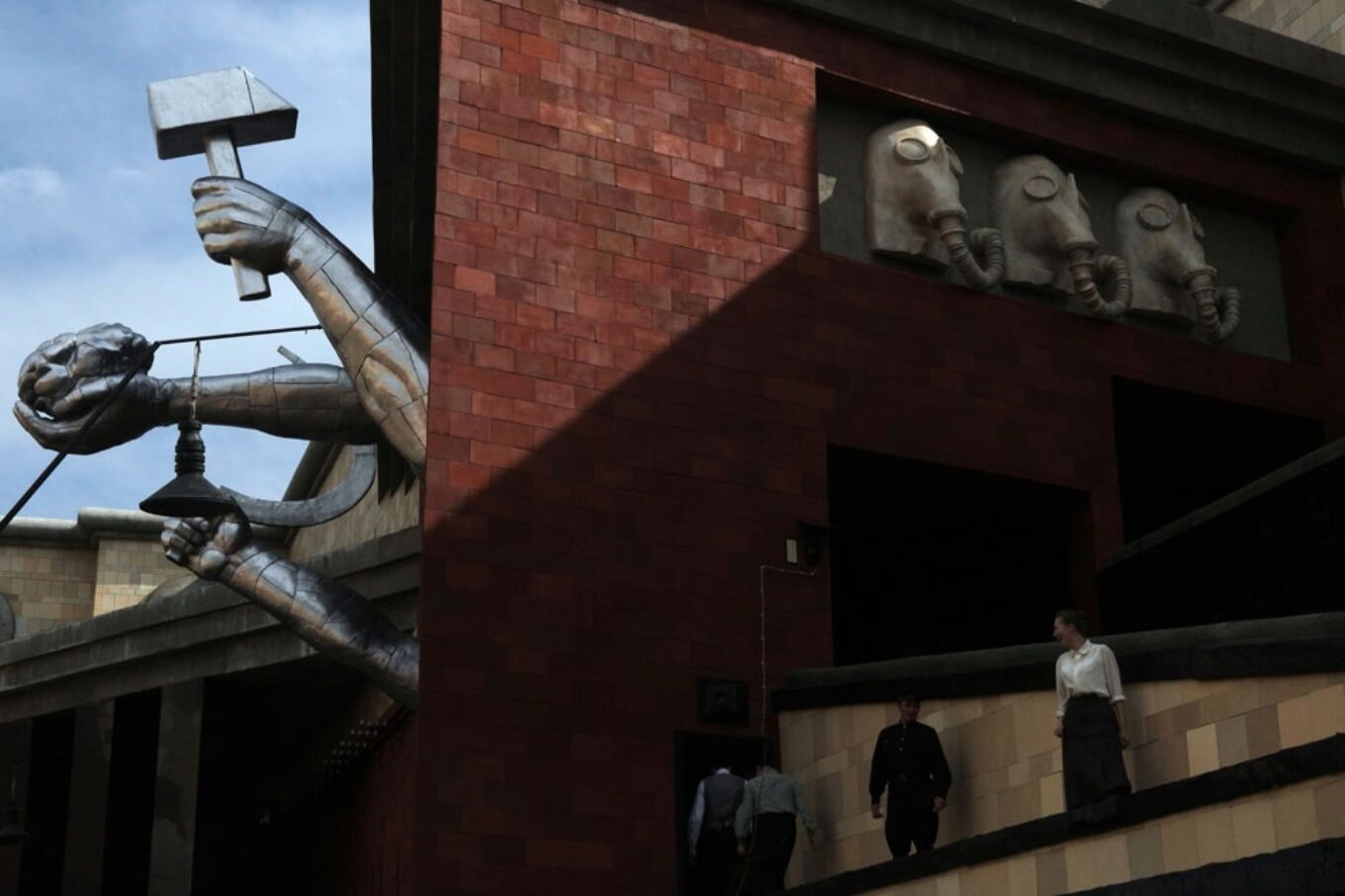 Именно там был сооружен съемочный павильон площадью 6 тысяч квадратных метров – четырехугольное здание со двором-колодцем и фасадами, украшенными монструозными барельефами – коммунистической символикой, головами в противогазах, колпаками ядерных реакторов.