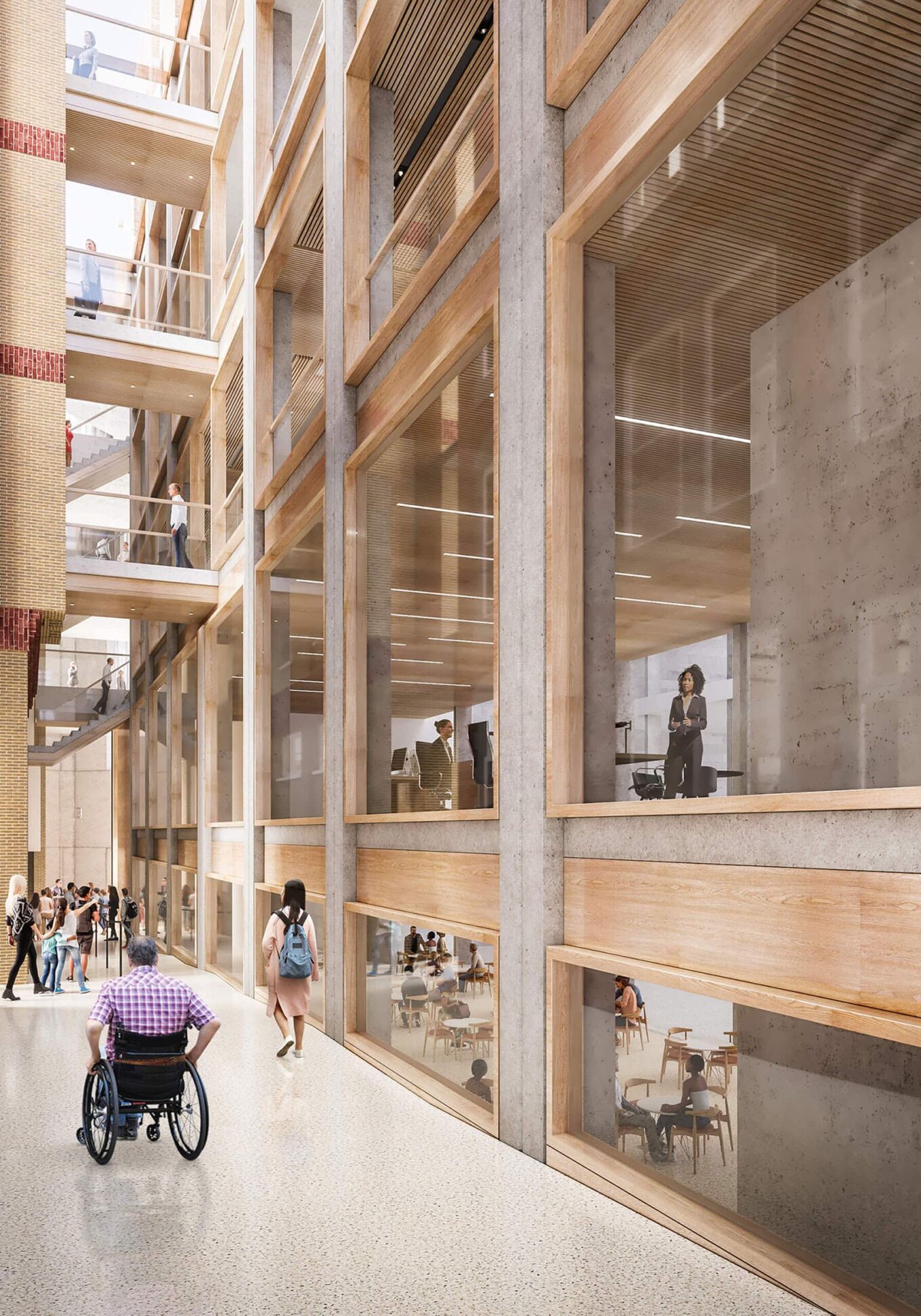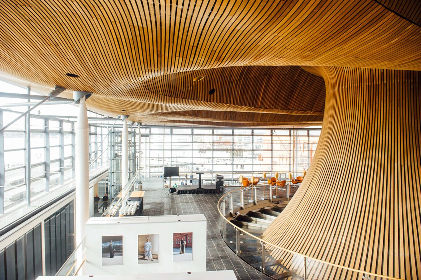 Охочі можуть вільно пройти до зали або у фоє Сенедду, в центрі якого наче виростає гігантське дерево з дерев’яних пластин
