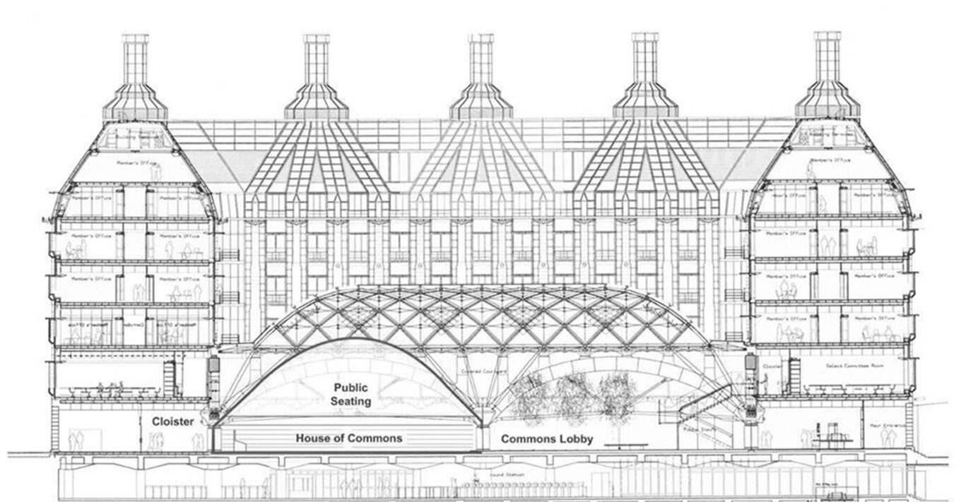 Ще у 2018 р. парламентарі вирішили з’їхати з Вестмінстерського палацу. Неоготичний будинок, спроєктований Чарльзом Беррі та Огастесом П’юджином, потребує термінової реставрації, а його інтер’єри — реконструкції. Перспектива капітального ремонту відчиняє вікно можливостей для якісного оновлення колиски британського парламентаризму, адже за 200 років уявлення про комунікації та роботу парламенту загалом сильно змінилися.