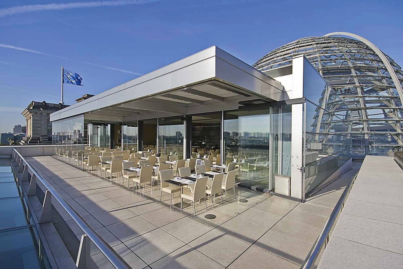 Сотні туристів щодня приходять до Рейхстагу, щоб подивитися, як працюють німецькі депутати, і піднятися спіралеподібними рампами всередині прозорого купола на оглядовий майданчик, звідки відкривається панорама Берліна. На даху знаходиться ресторан Kаеfer.