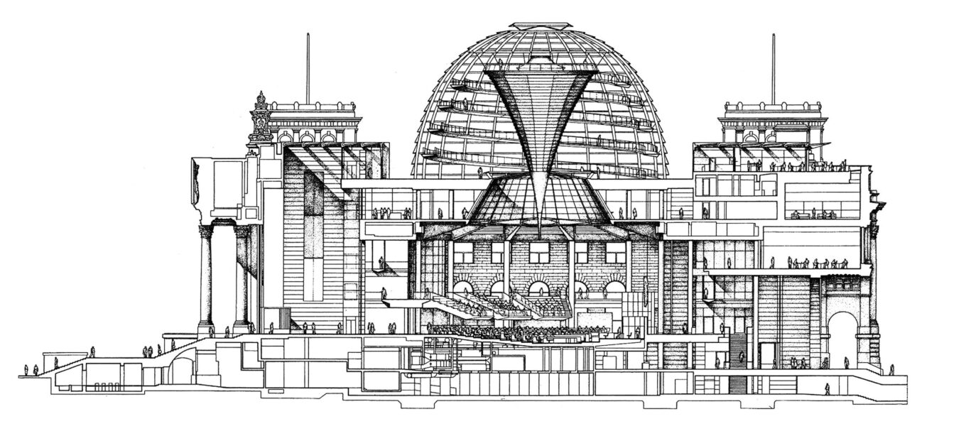 Дзеркальна воронка, що піднімається з парламентської зали, наповнює купол грою сонячного світла. Завдяки прозорій оболонці виблискування дзеркал помітне навіть здалеку. Із функціонального погляду купол є частиною автономної енергосистеми, що фільтрує повітря в приміщеннях і регулює інсоляцію, але насамперед він є символом сучасного Берліна.