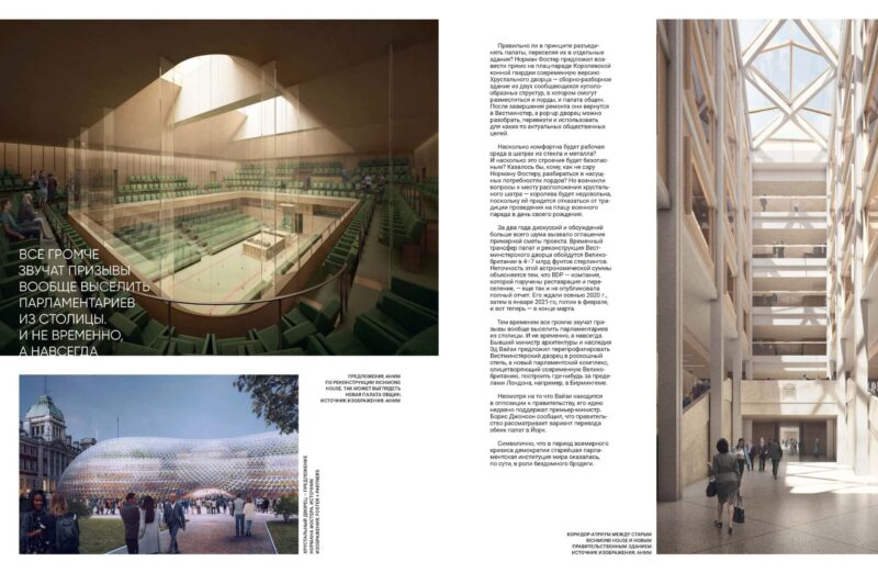 Чи правильно в принципі роз’єднувати палати, переселяючи їх до окремих будівель? Норман Фостер запропонував звести прямо на плац-параді Королівської кінної гвардії сучасну версію Кришталевого палацу — збірно-розбірний будинок із двох сполучених куполоподібних структур, у якому зможуть розміститися і лорди, і палата громад. Після завершення ремонту вони повернуться до Вестмінстера, а pop-up палац можна розібрати, перевезти та використовувати для якихось актуальних громадських цілей.