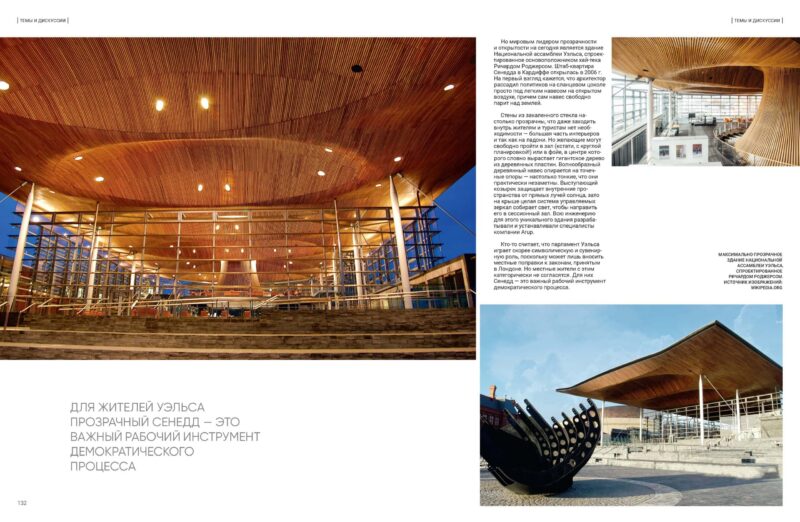 Але світовим лідером прозорості та відкритості сьогодні є будівля Національної асамблеї Уельсу, спроєктована основоположником хай-теку Річардом Роджерсом. Штаб-квартира Сенедда в Кардіффі відкрилася в 2006 р. На перший погляд здається, що архітектор розсадив політиків на сланцевому цоколі просто під легким навісом на відкритому повітрі, причому сам навіс вільно ширяє над землею.