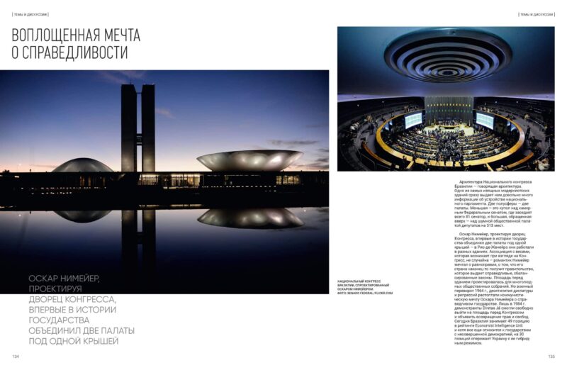 Архітектура Національного конгресу Бразилії — архітектура, що говорить. Одна з найвитонченіших модерністських будівель одразу видає нам чимало інформації про влаштування національного парламенту. Дві півсфери — дві палати. Менша — це купол над камерним Федеральним сенатом, де засідає лише 81 сенатор, і більша, звернена вгору, — над галасливою громадською палатою депутатів на 513 місць.