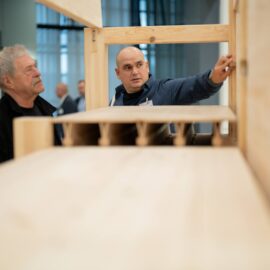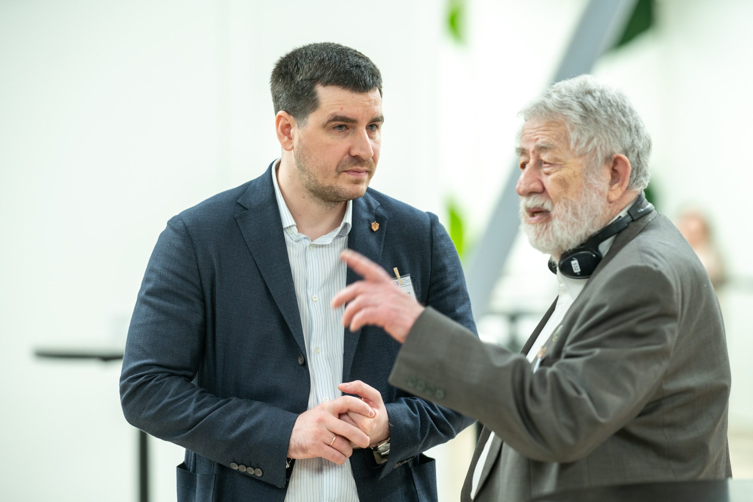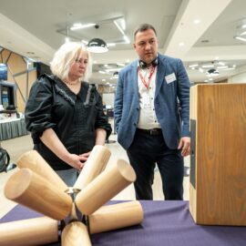 Першу тему розкрив професор Дрезденського університету Роберт Йоквер. Науковець почав свою доповідь із наочних прикладів: «Нині в Гетеборзі, Швеція, будують восьмиповерхову офісну будівлю. Опорна конструкція споруди зроблена з бетону, але решта її елементів — дерев’яні. Важливо зазначити, що за жорсткість таких конструкцій відповідають конектори. До слова, найвища з досі зведених будівель із деревини на сьогодні — 80 метрів, а місце зведення — Норвегія. Вона має сотні різних конекторів. Проєктувальникам було нелегко забезпечити достатню міцність і пластичність, але вони впорались. Тож, як ви розумієте, ситуація така: ми виходимо на новий рівень щодо поверховості, ширини й пролітності, але нам щоразу доводиться працювати над конекторами. І саме це сьогодні — наше головне завдання!».