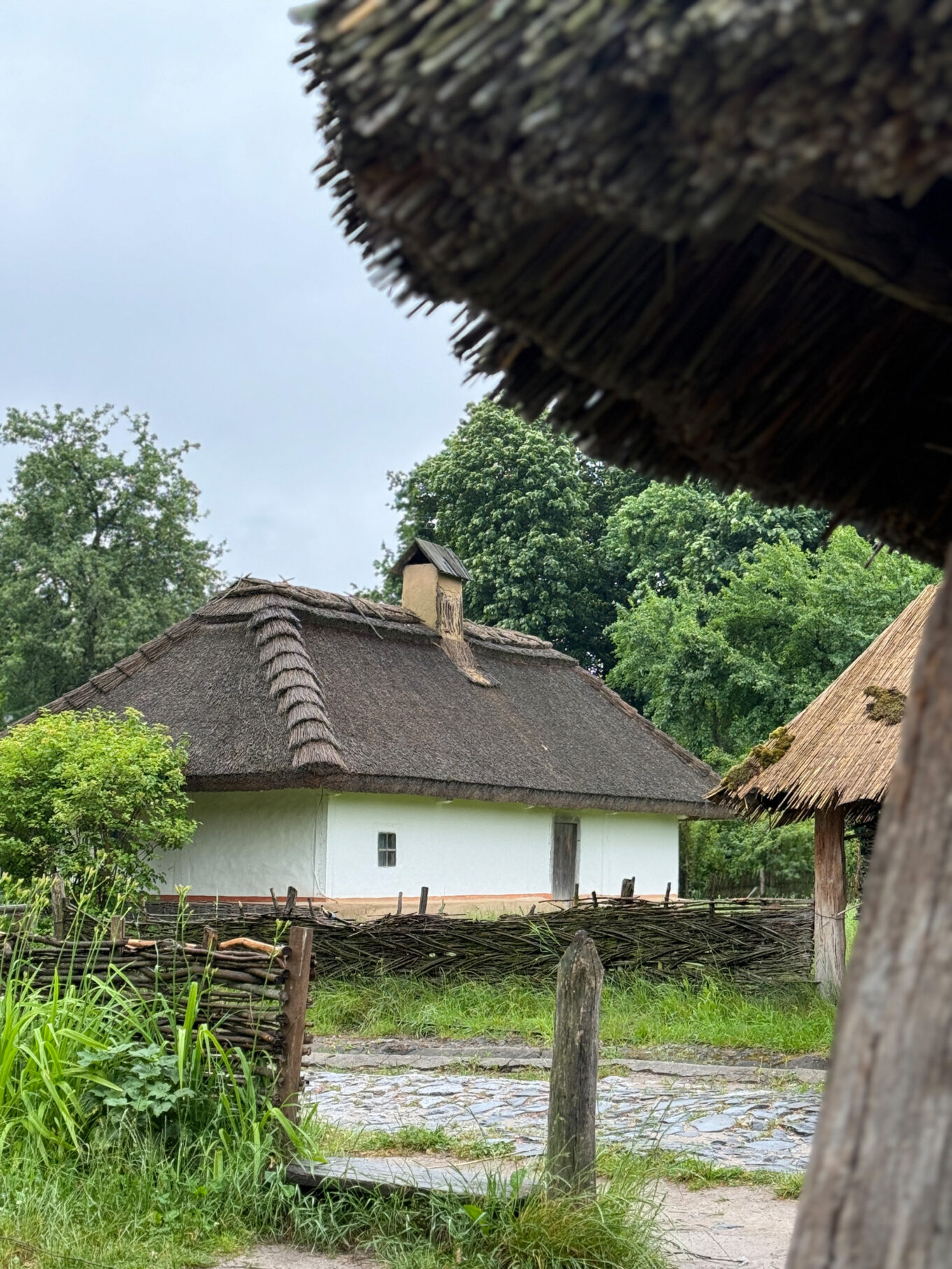 Хати в Україні розрізняють за типом конструкції — зрубні, каркасні та мазані, і всі три типи представлені на території музею. Також тут відображений розвиток типології хат: від однокамерної споруди, появи сіней, добудови холодних комор і до будинків заможних людей із декількома світлицями.