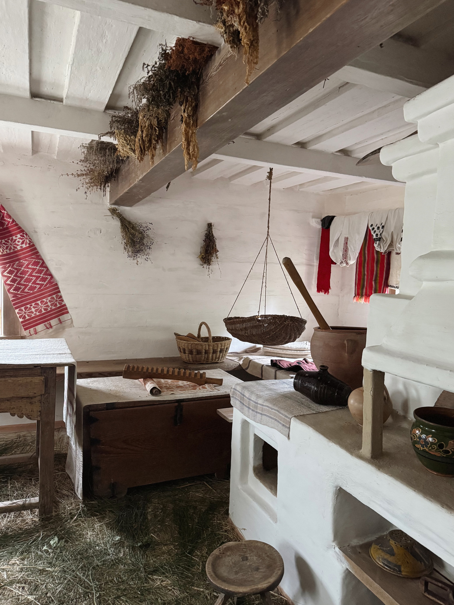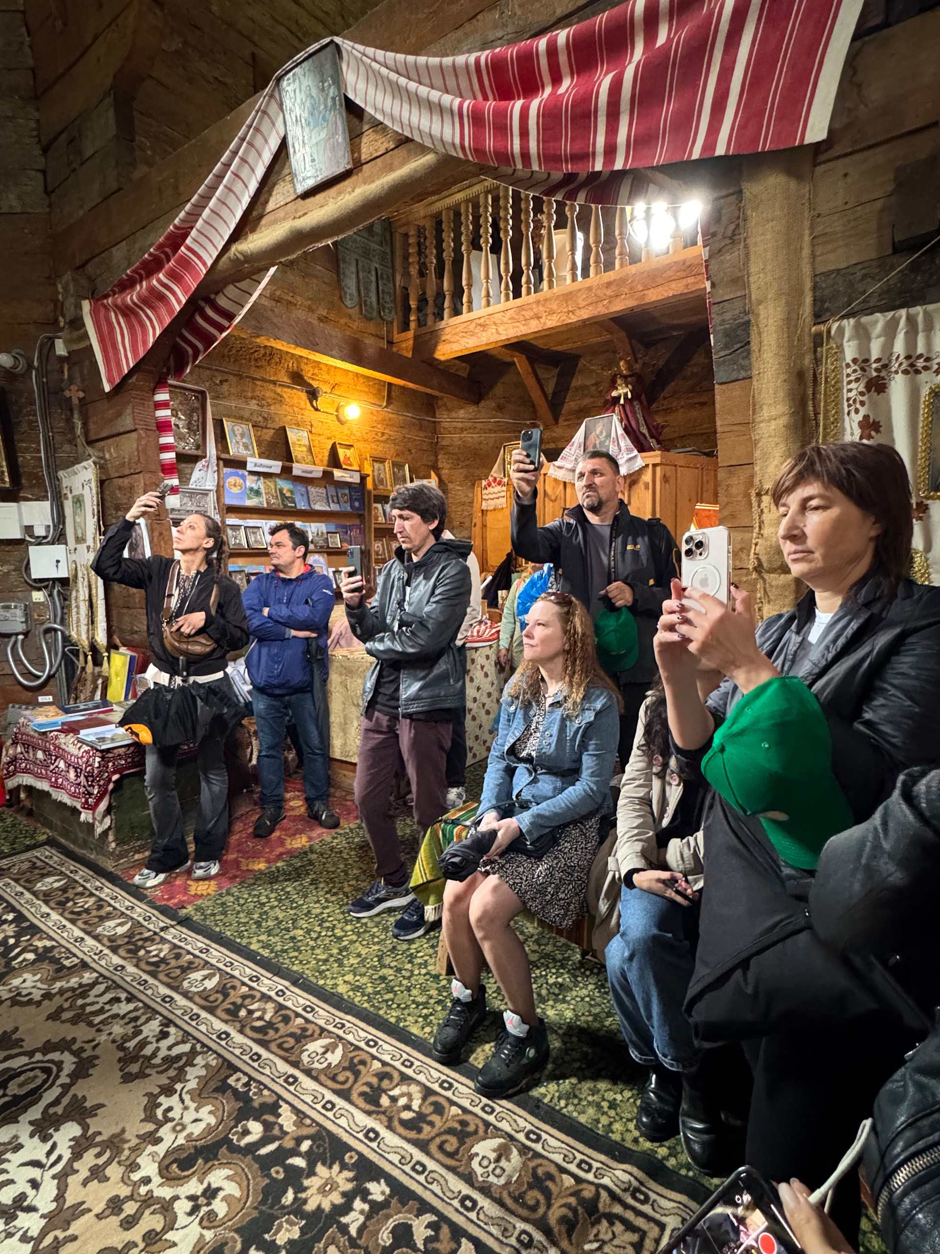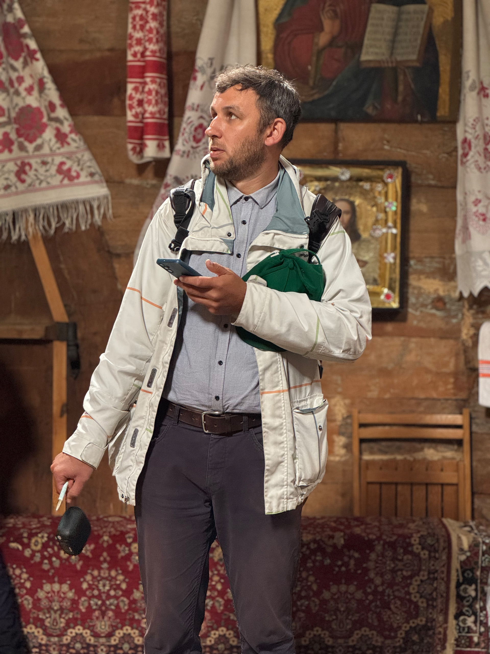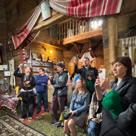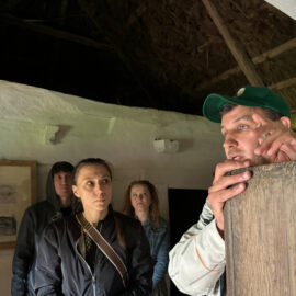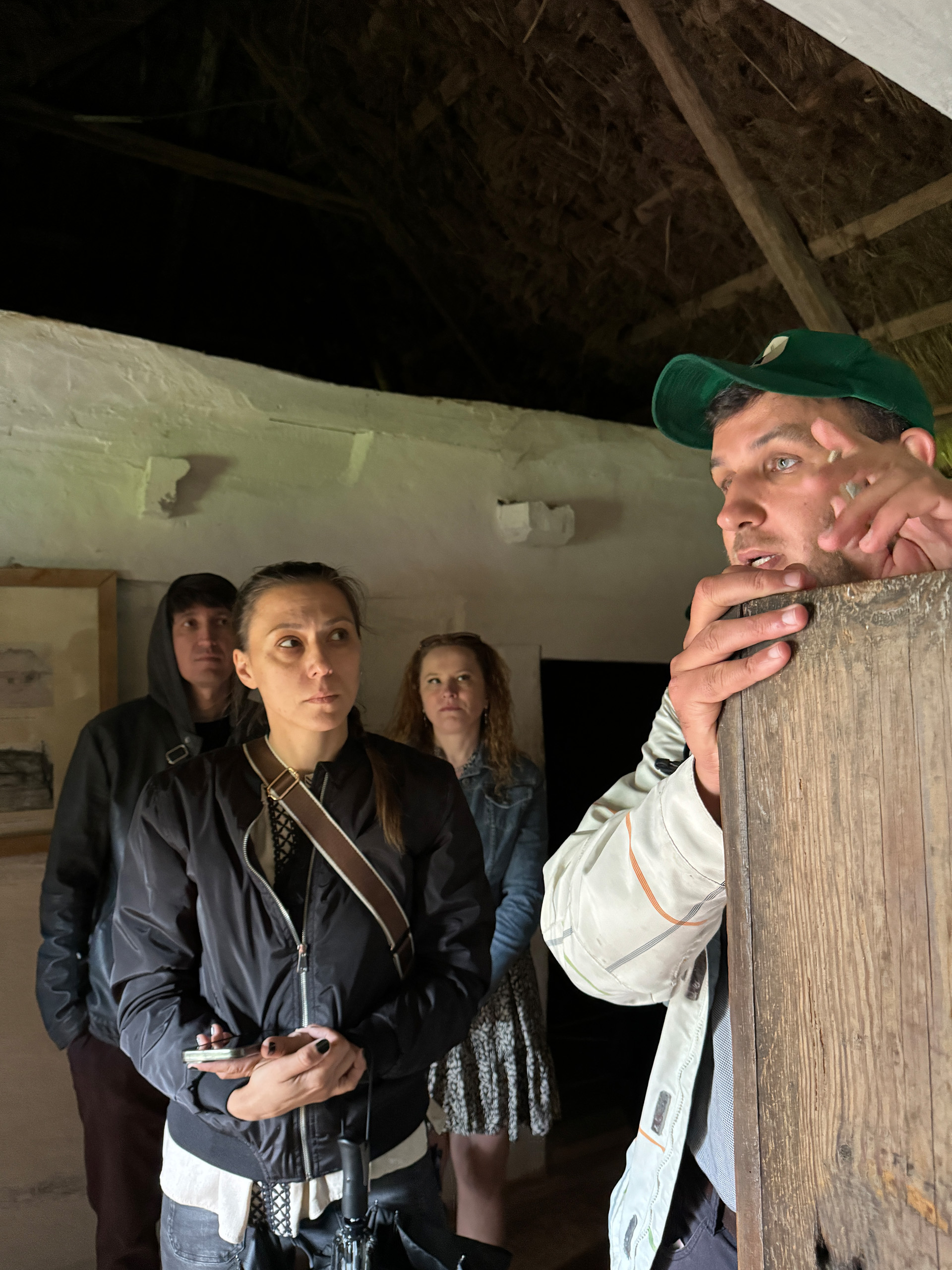 Разом з експертом гості розглянули типове планування хат: при вході в світлицю розташована піч, по діагоналі від неї — святий кут, а по периметру — лави. Говорили й про освітлення в українських хатах: лучини, свічки воскові та лоєві, каганці.