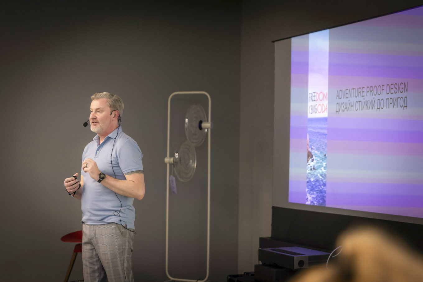 Олег Волосовський показав низку нових проєктів loft buro, розроблених протягом останнього року. Головною темою вечора стали тенденції у проєктуванні мобільного житла із залученням принципів універсального дизайну, пов’язані саме водною тематикою. Олег наголосив, що ці проєкти натхнені подорожами, свободою, комфортом, новими можливостями, продиктованими стійкістю й волелюбністю.