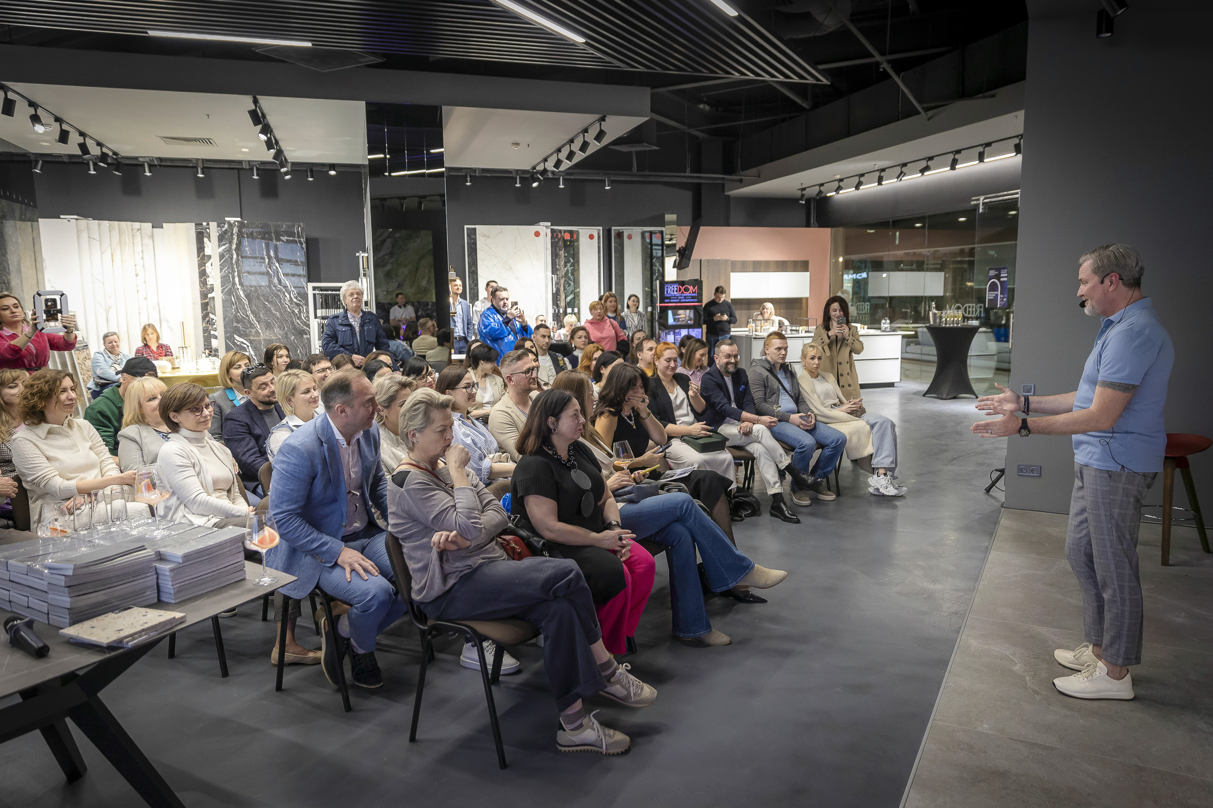 Врешті програма продовжилась виступом Олега Волосовського. Свою промову архітектор розпочав із роздумів про філософію якості життя та про бренд як показник належності до спільноти, до чогось більш якісного та прекрасного, вираженого в матеріалі.