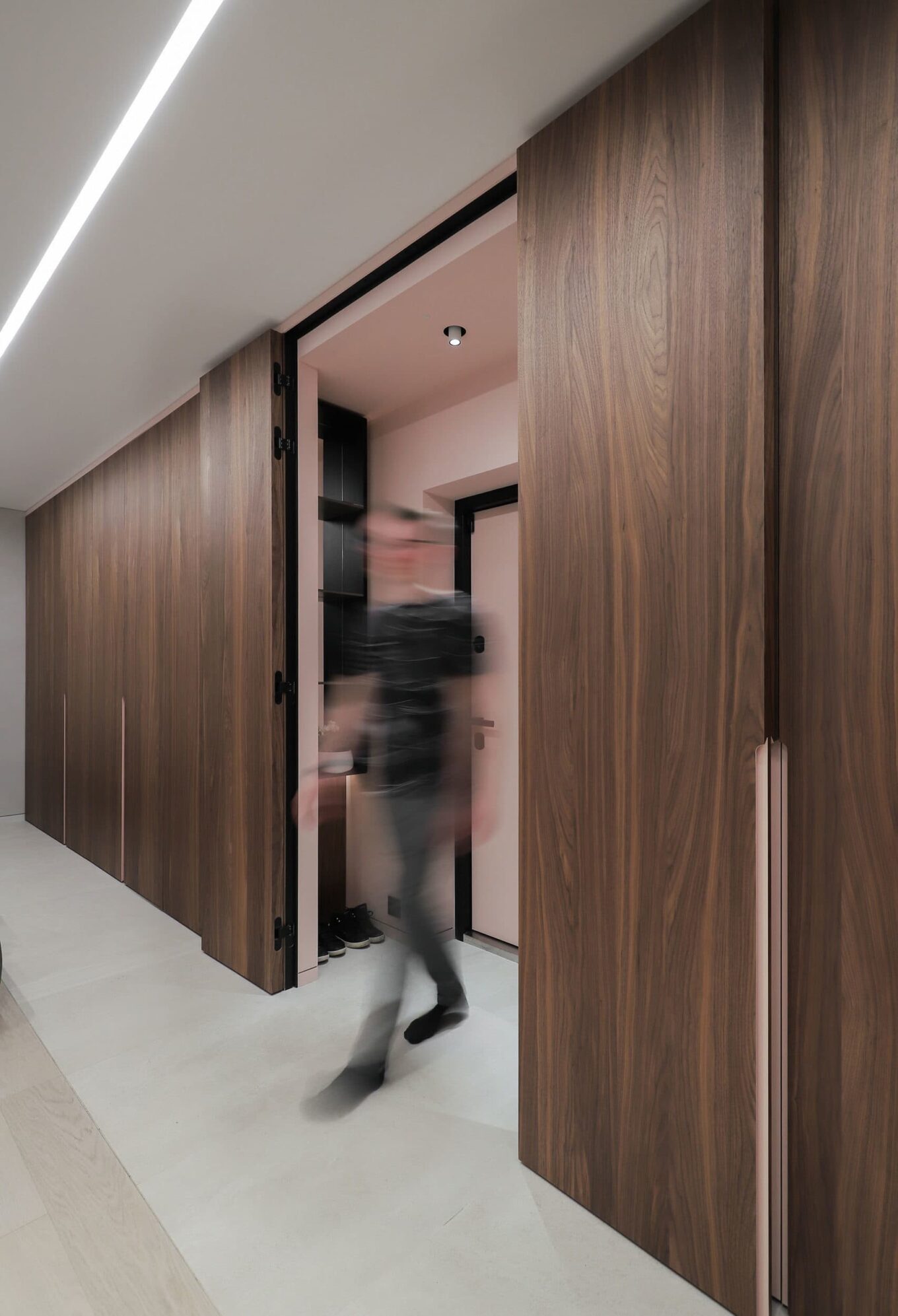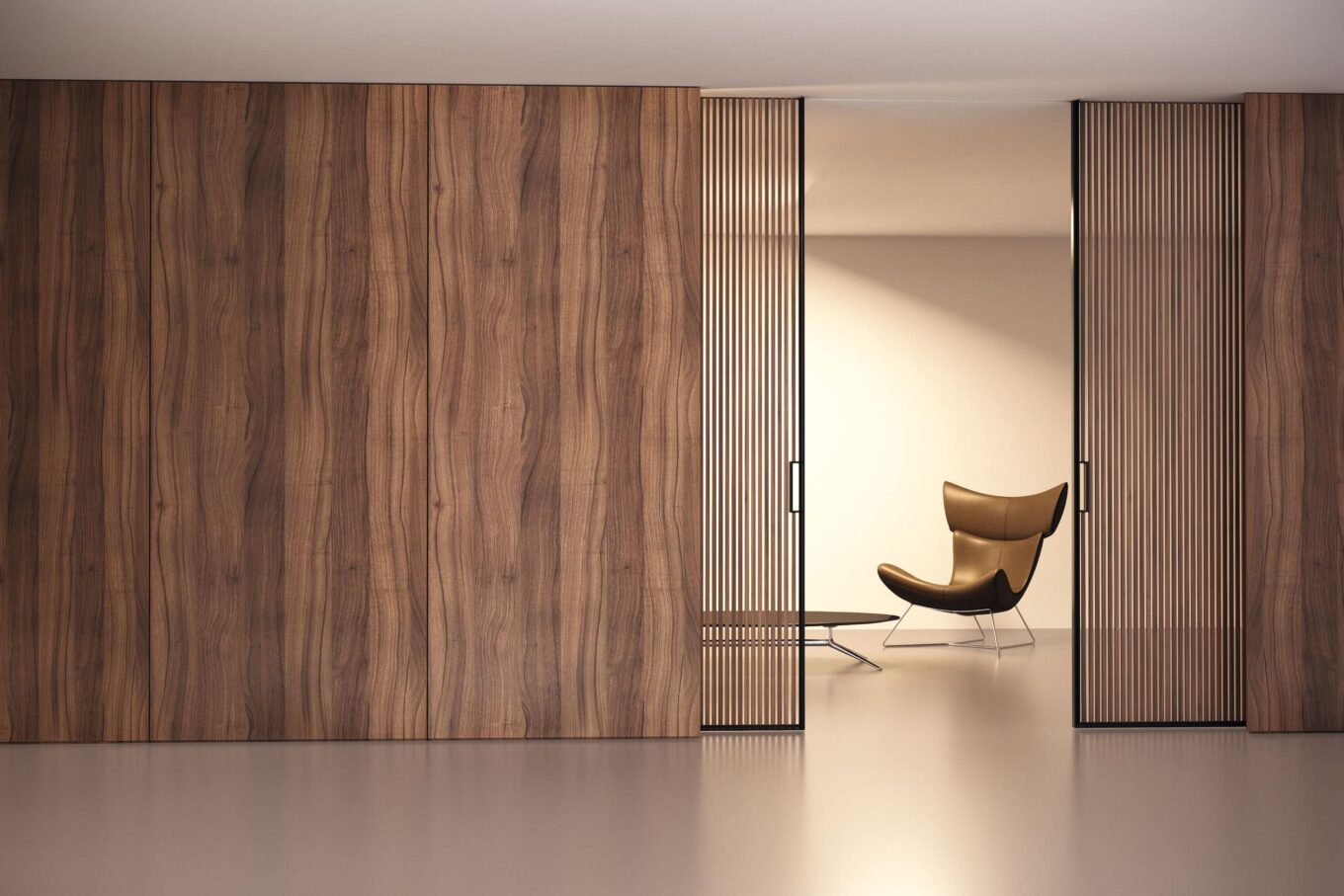 Платформне рішення у вигляді поєднання стінових панелей із розшивкою та міжкімнатних перегородок із рейками зі шпону в єдиному матеріалі та оздобленні