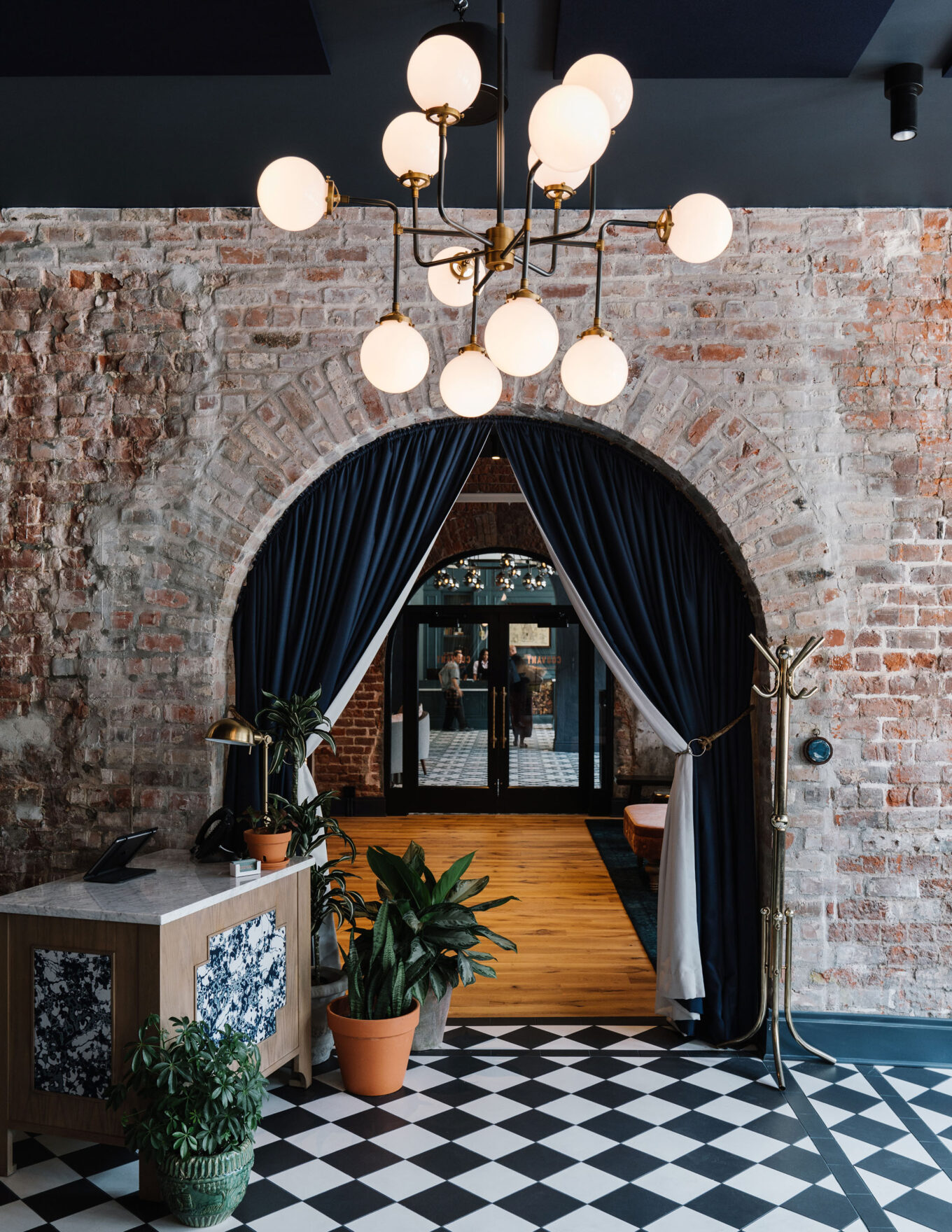 Сначала попадаешь в экстравагантное лобби, акцентированное живой зеленью и полом с оригинальным рисунком, выложенным из плитки шестигранной формы. Лаунж-зону от основного публичного пространства отделяет перегородка со вставками из рифленого стекла, служившая раньше частью фасада магазина, а чуть дальше в глубине открывается 60‑метровый атриум. В нем посередине устроен длинный бар с мраморной столешницей, окруженной барными стульями из тисненой крокодиловой кожи. Большое окно в крыше и пышная зелень повсюду несколько смягчают брутальность открытой оригинальной кирпичной кладки и стен в штукатурке грифельного цвета, а вместе с укрытой листвой стеклянной решеткой навеса над баром создают ощущение теплицы или оранжереи. Старинные восточные ковры и эклектичная коллекция декоративных светильников с латунными деталями завершают антураж.