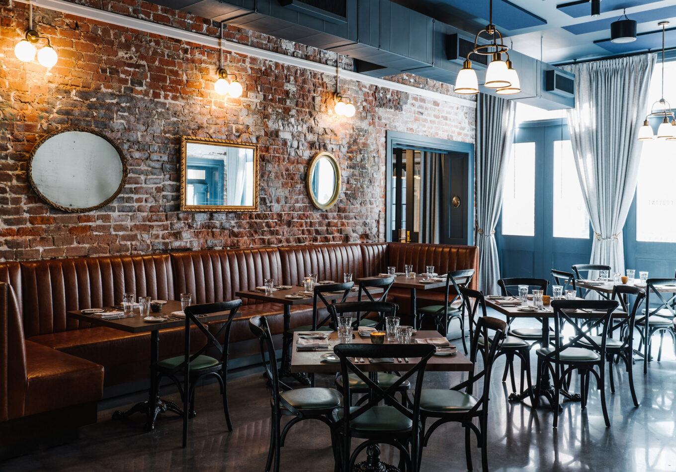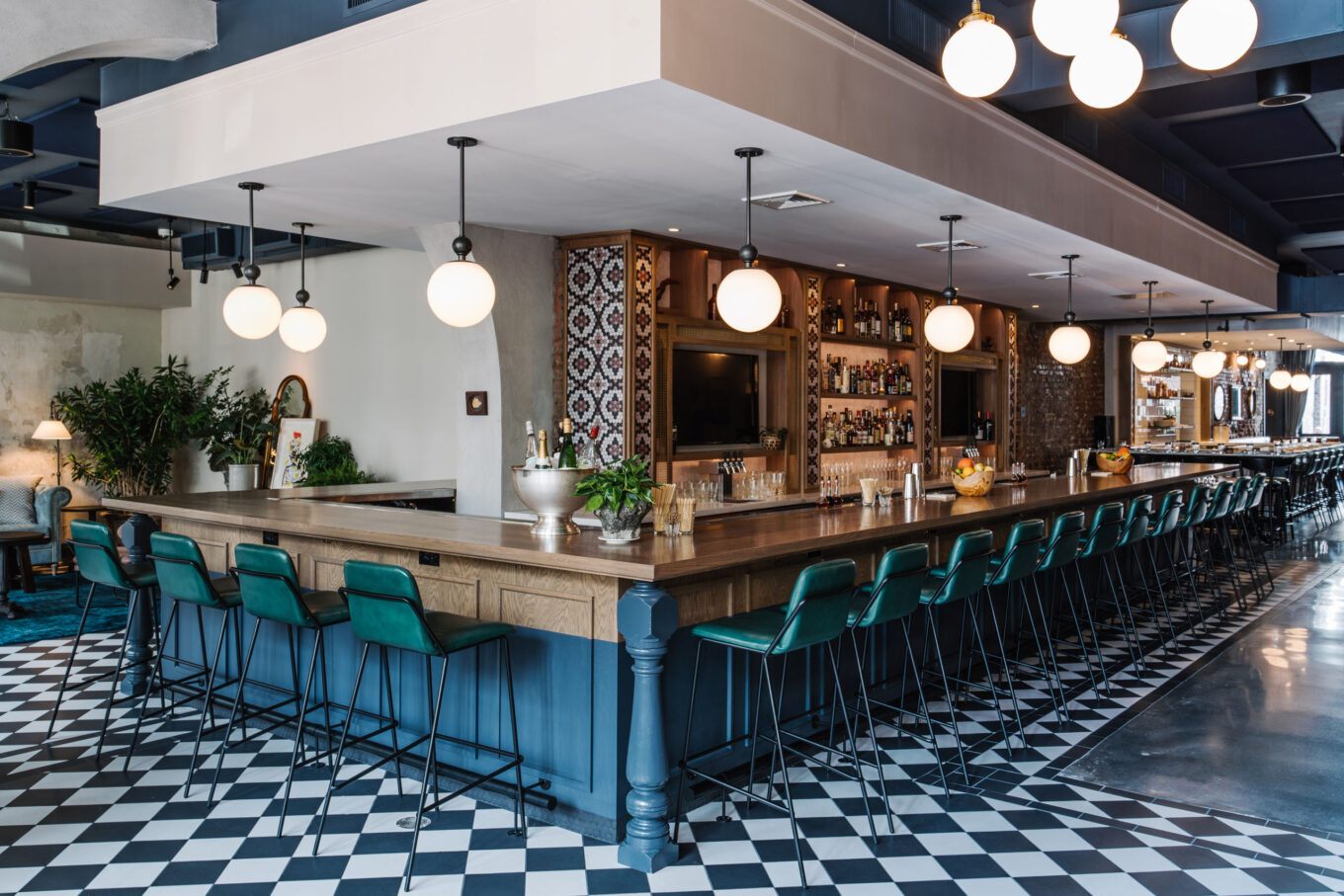 Вполне логично, что ресторан отеля Couvant расположили внутри бывшего завода Peychaud’s Bitters, производившей знаменитые биттеры Пейшо: в 1830 г. их создал обосновавшийся в Новом Орлеане креольский аптекарь Антуан Амеди Пейшо. Эстетика индустриального пространства здесь сочетается с классическим новоорлеанским стилем и легким французским флером. Акцент в первом зале — черно-белый кафельный пол. Широкий бар площадью 28 кв. м сделан из дуба, а у исторических окон, выходящих на Мэгезин-стрит, установили стойки и разместили барные табуреты, от чего помещение стало еще больше напоминать традиционное брассери. Но дальше оно разворачивается в более современное пространство обеденного зала, а пол из кафельного становится бетонным.