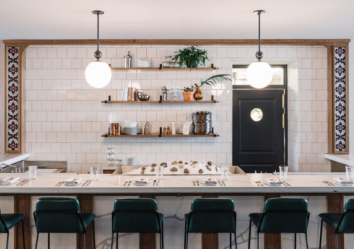 В нем предусмотрено два вида рассадки — на диванах из седельной кожи коричневого цвета или как в типичном бистро — за расставленными повсюду квадратными столиками. Маленький устричный бар со стойкой из кварца облицован белой плиткой. Он обрамлен деревянной рамой с красиво выложенным по бокам узорчатым «кантом» из шестигранной плитки — и это еще один изящный намек на французское брассери.