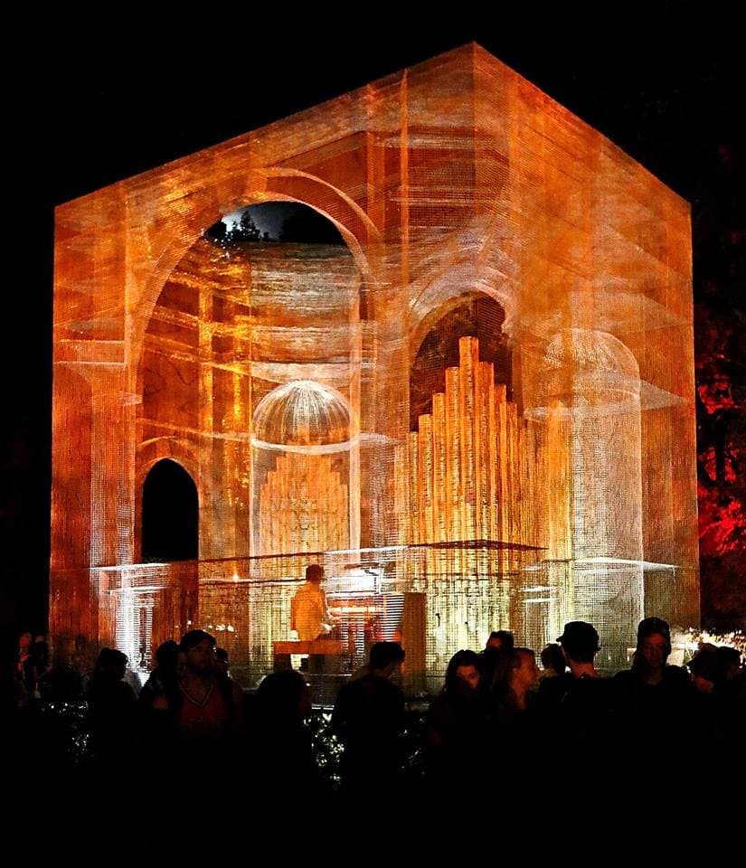 Скульптура, практически незаметная днем, вечером в свете софитов превращалась в ажурную барочную камеру. В проекте принимали участие английский органист Джеймс МакВинни и музыкант из Америки Гриффин МакМэхон.
