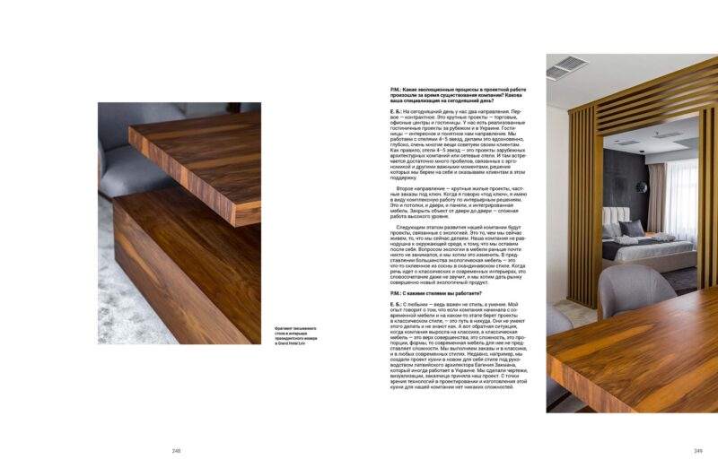 Е. Б.: На сегодняшний день у нас два направления. Первое — контрактное. Это крупные проекты — торговые, офисные центры и гостиницы. У нас есть реализованные гостиничные проекты за рубежом и в Украине. Гостиницы — интересное и понятное нам направление. Мы работаем с отелями 4–5 звезд, делаем это вдохновенно, глубоко, очень многие вещи советуем своим клиентам. Как правило, отели 4–5 звезд — это проекты зарубежных архитектурных компаний или сетевые отели. И там встречается достаточно много пробелов, связанных с эргономикой и другими важными моментами, решение которых мы берем на себя и оказываем клиентам в этом поддержку.