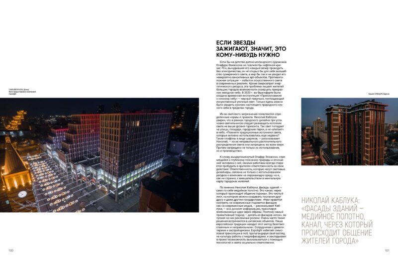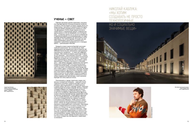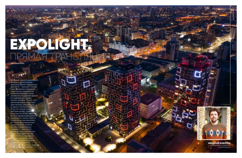 Робота зі світлом має містити не лише функціональні та естетичні аспекти, а й бути суспільно значущою — так вважає керівник і засновник студії Expolight Микола Каблука. У його розумінні світловий дизайнер несе величезну відповідальність, пов’язану із впливом на довкілля, культуру та громадську думку.