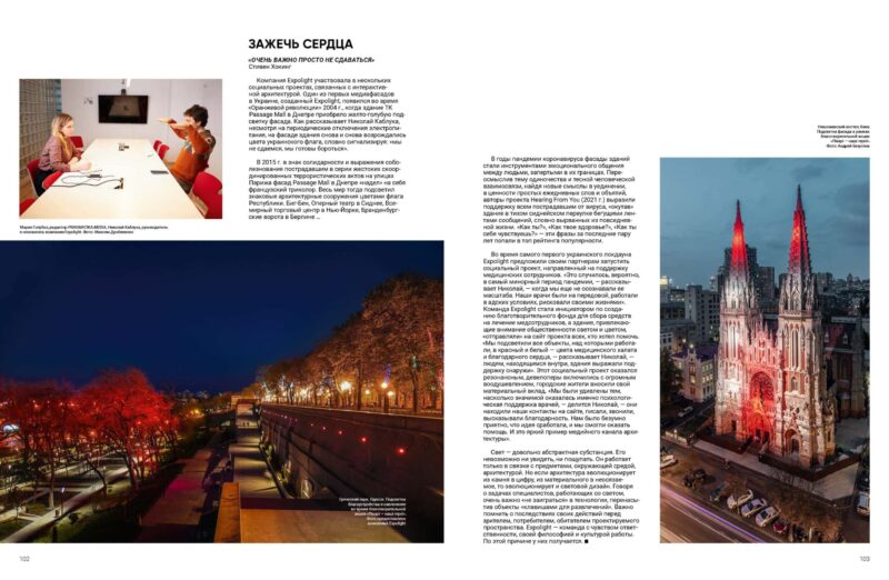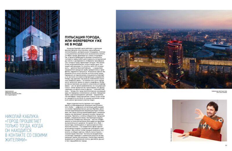 Команда Expolight часто працює з великими архітектурними комплексами, масштабними інсталяціями, центральними площами, тому фахівці компанії мають можливість впливати на образ міста, формуючи його нові лендмарки.