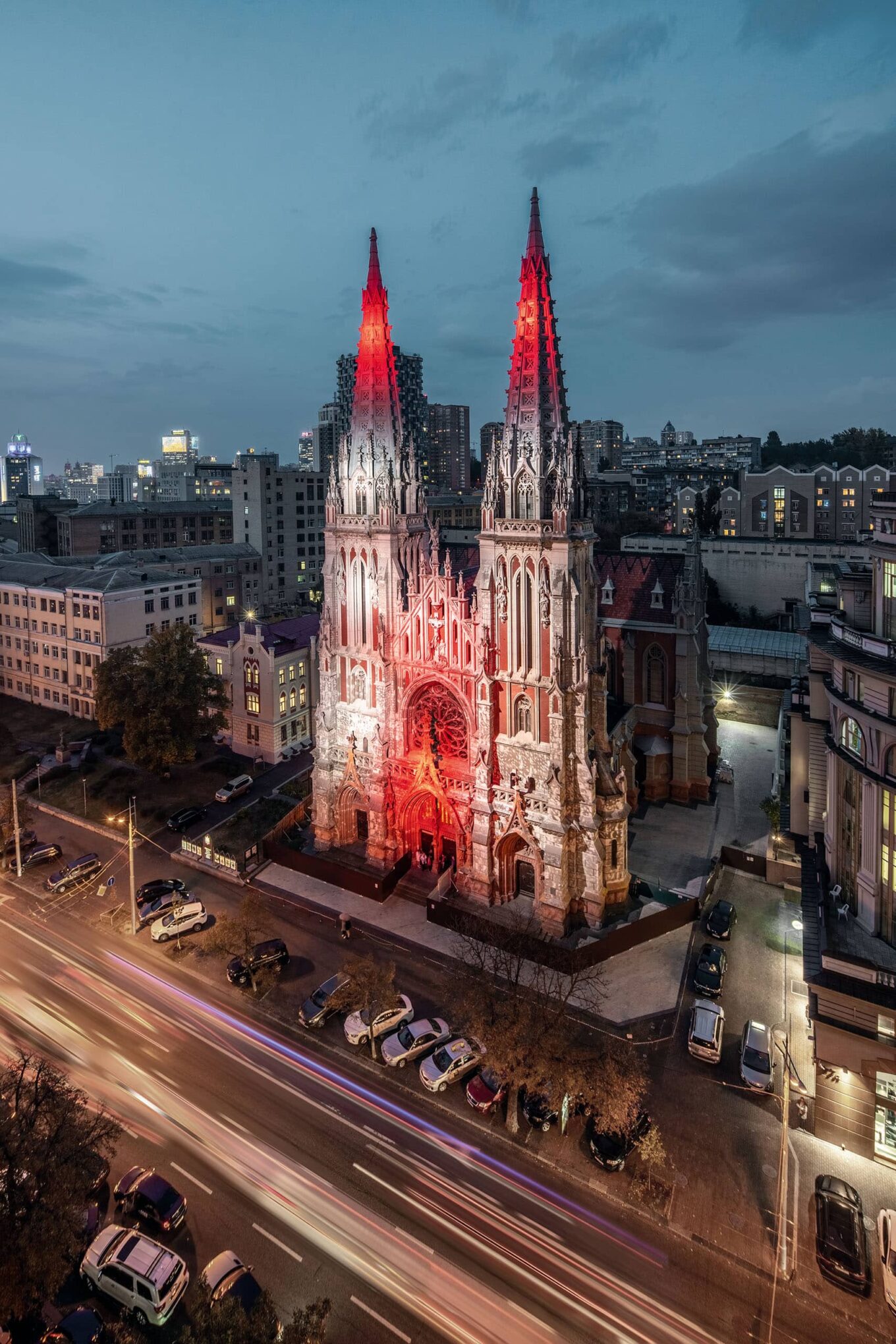 Миколаївський костел, Київ. Підсвічування фасаду в рамках благодійної акції «Лікарі — наші герої». Фото: Андрій Безуглов