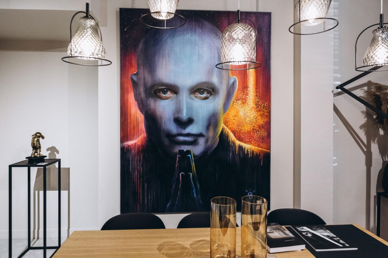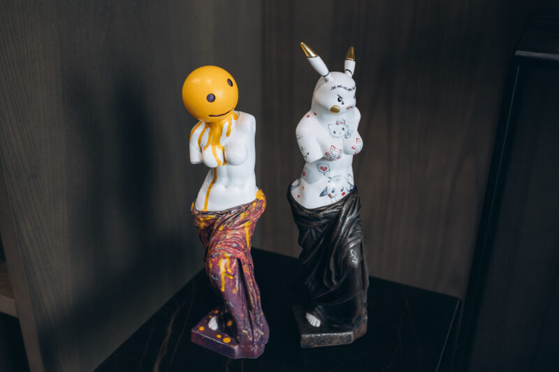 Часть культуры Gaggenau — поддержка современных художников. В пространстве нового шоурума гости с любопытством рассматривают арт-объекты. В центре внимания полотно «Фантомаск», у другой стены — картина «о стыке коммунизма и капитализма» Dior, плюс целое скульптурное семейство осовремененного Чебурашки. А вот и сам автор — Евгений Лапченко. Над созданием героев в рамках проекта Grand$tyle художник работал вместе с коллегой и земляком Андреем Зубанем.