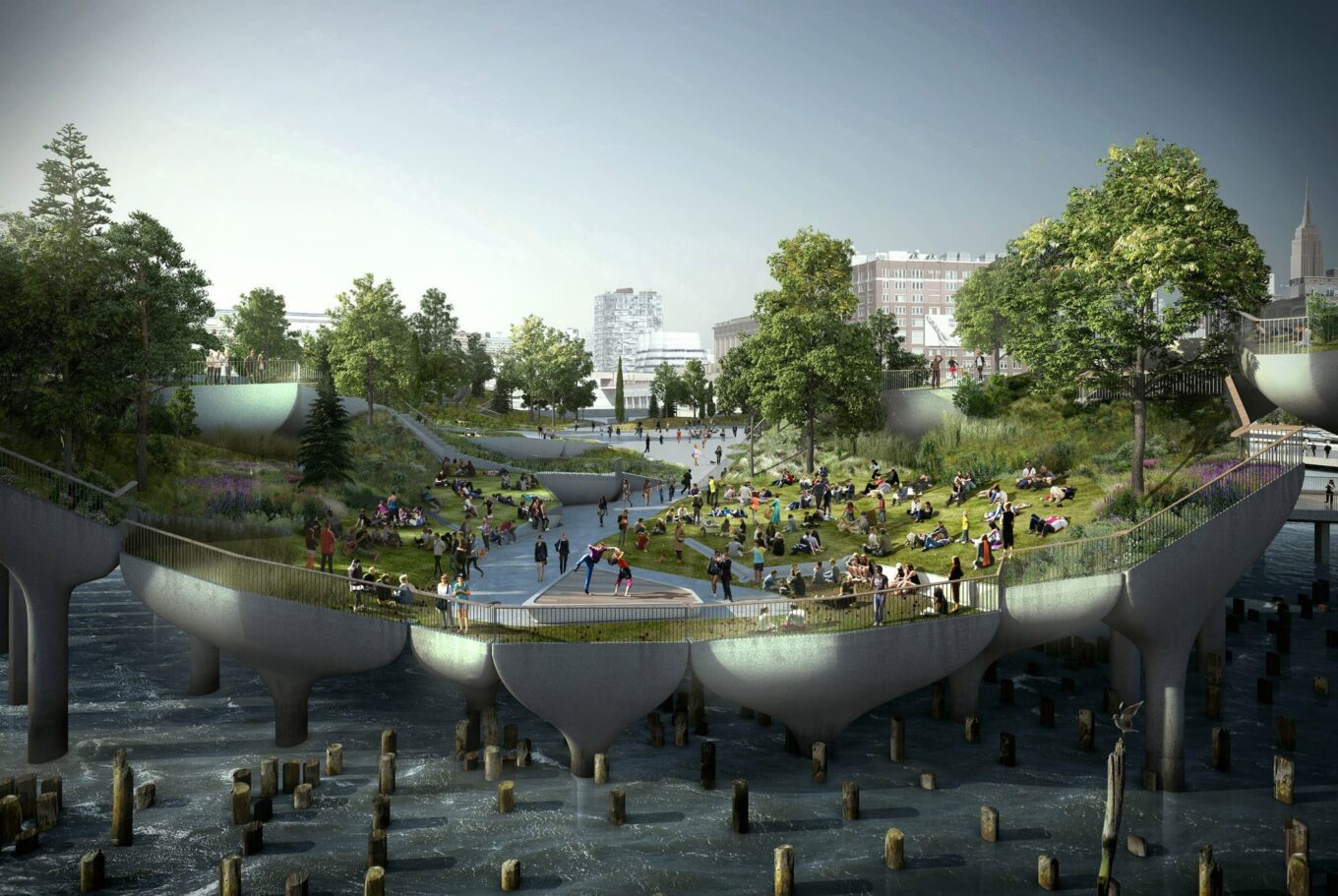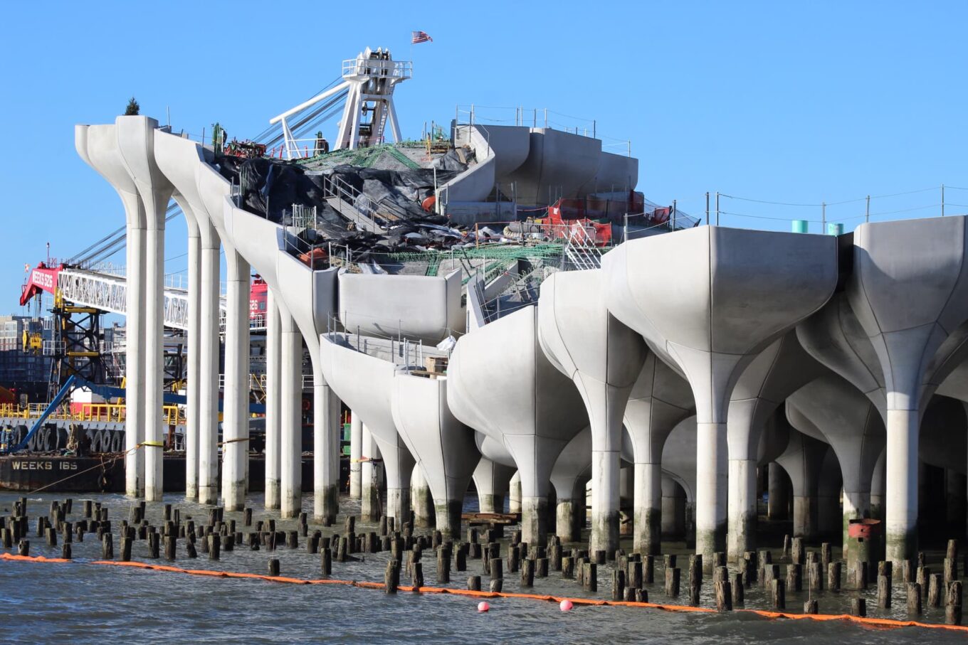 Ідея опор, що були розроблені для Garden Bridge і нагадують латаття, лілії чи тюльпани, не була відкинута. Прямо зараз абсолютно банальний старий причал у Нью-Йорку перетворюється на футуристичний громадський парк. Січневі фотографії Pier 55 демонструють, що проєкт входить у заключну фазу.