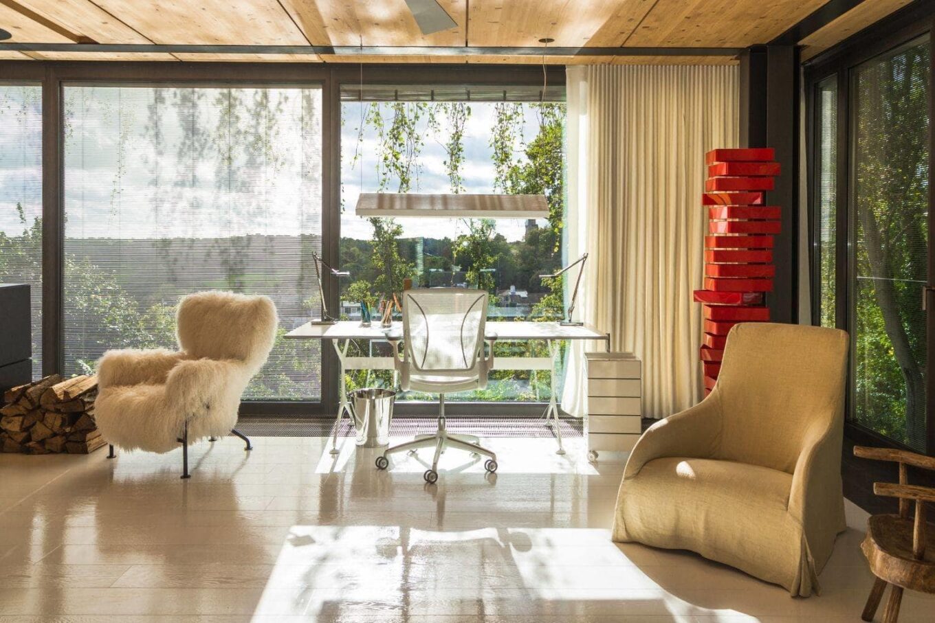 Робоча зона Старка на другому поверсі. Тут все вирішене у світлих тонах. На підлозі лаковане дерево, на вікнах — білий текстиль. Волохате крісло створив Франко Альбіні для Cassina