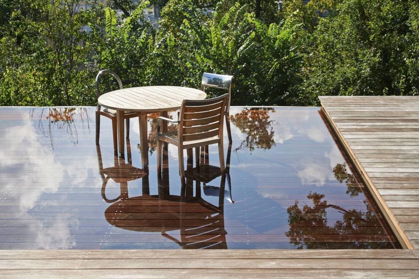 Перший поверх будівлі Старк оснастив відкритою терасою з тиковою палубою, в яку вмонтував басейн. Гідравлічна платформа дозволяє регулювати глибину його чаші. Або повністю приховати басейн, на місці якого можна, наприклад, розмістити барбекю. Меблі на терасі розроблені самим власником (Sutherland, колекція Robinwood).