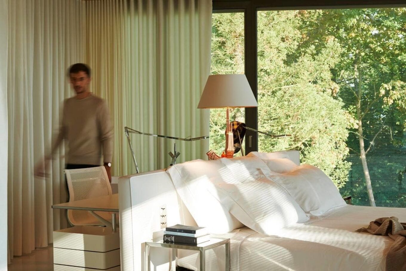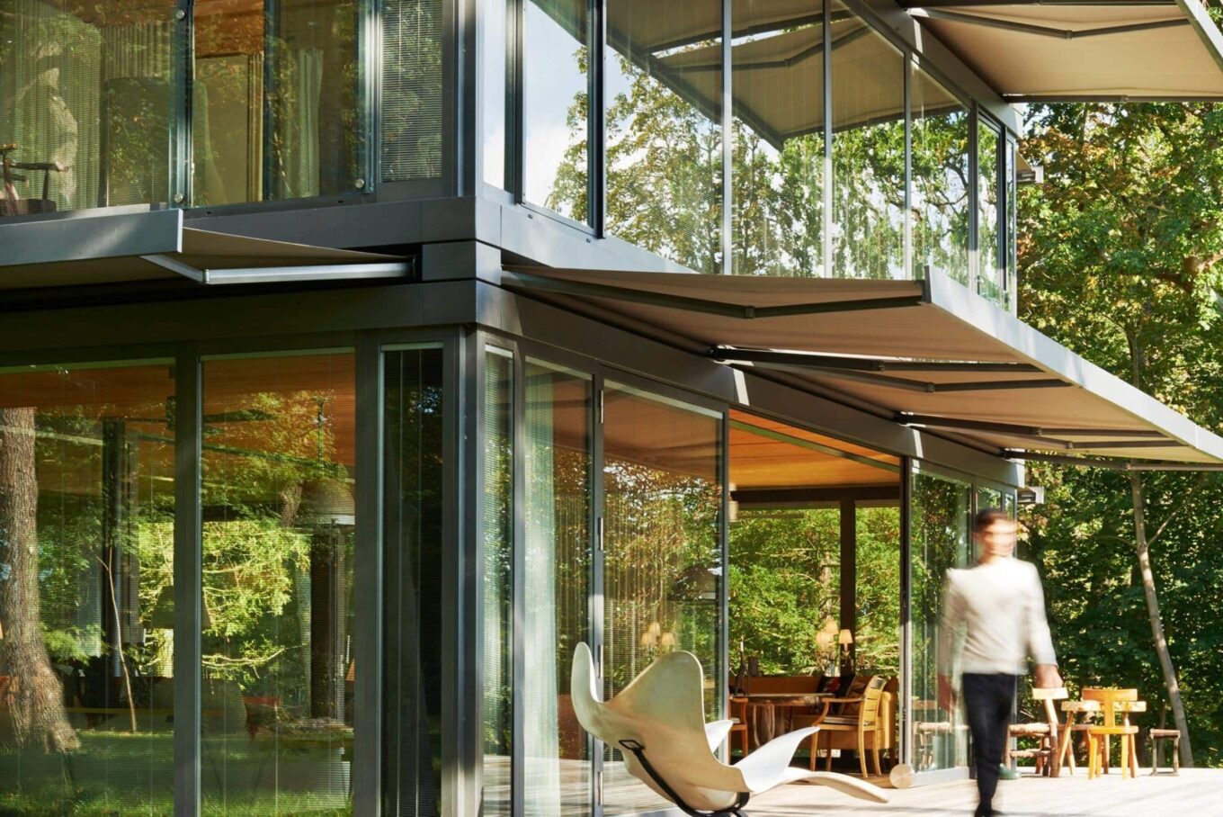 Суцільне фасадне скління французького будинку сімейства Старків не лише стирає кордон між інтер’єром особняка та навколишнім ландшафтом, але й чудово справляється з функцією терморегуляції — скління в три шари завтовшки 63 мм, теплоізоляція на основі кам’яної вати. Комп’ютерна програма керує системою висувних зовнішніх маркізів і жалюзі, відкриваючи внутрішні простори сонцю або автоматично притінюючи їх, коли це необхідно.