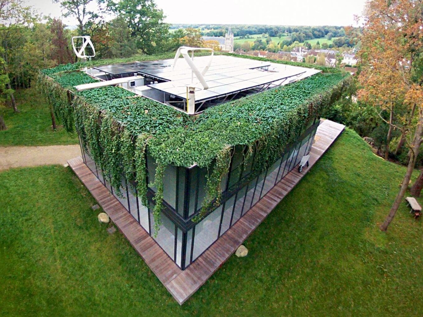 Готові дерев’яні модулі будинку збираються на місці як конструктор Lego. На даху — зелень, що візуально поєднує будівлю з навколишньою природою. Химерний карниз приховує потужну систему енергозабезпечення, яка містить сонячні панелі та вітрогенератори. При цьому Старк підкреслює, що енергоспоживання всього особняка вдвічі менше за ту кількість, яку виробляє система на його покрівлі.