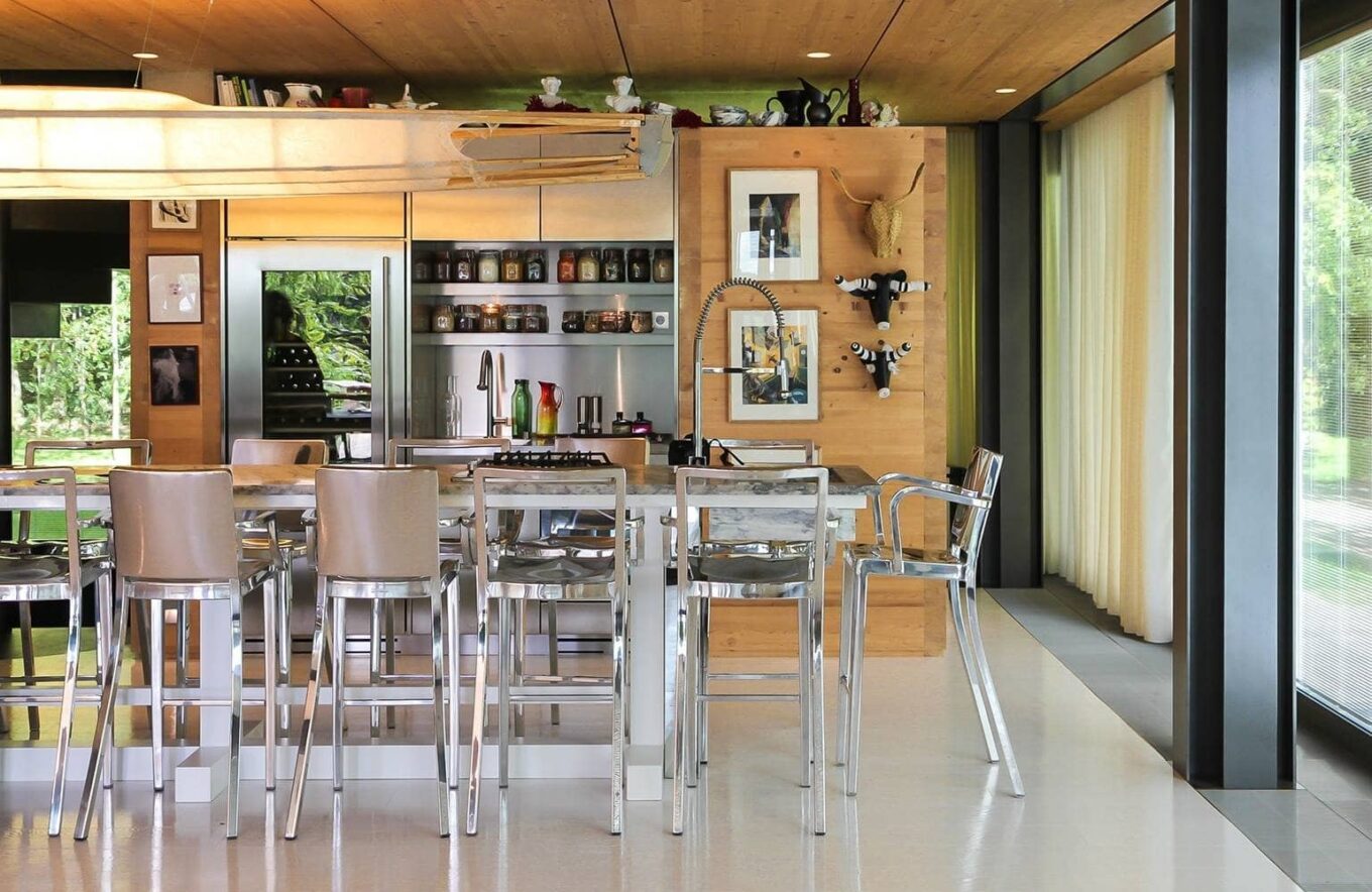 Навпроти Філіп передбачив зону їдальні зі шкіряним диваном і дерев’яними стільцями, які вдало вписалися в екологічний простір і перегукуються з теплим ялиновим оздобленням стелі й тиковою палубною дошкою на підлозі. У глибині — простора зона кухні, відокремлена від загального простору вітальні островом із мармуровою стільницею, яку фланкують елегантні високі барні стільці Hudson та Icon із переробленого алюмінію, спроєктовані Старком для Emeco. Під стелею — масштабний світильник у вигляді каное. Зрозуміло, власного дизайну.