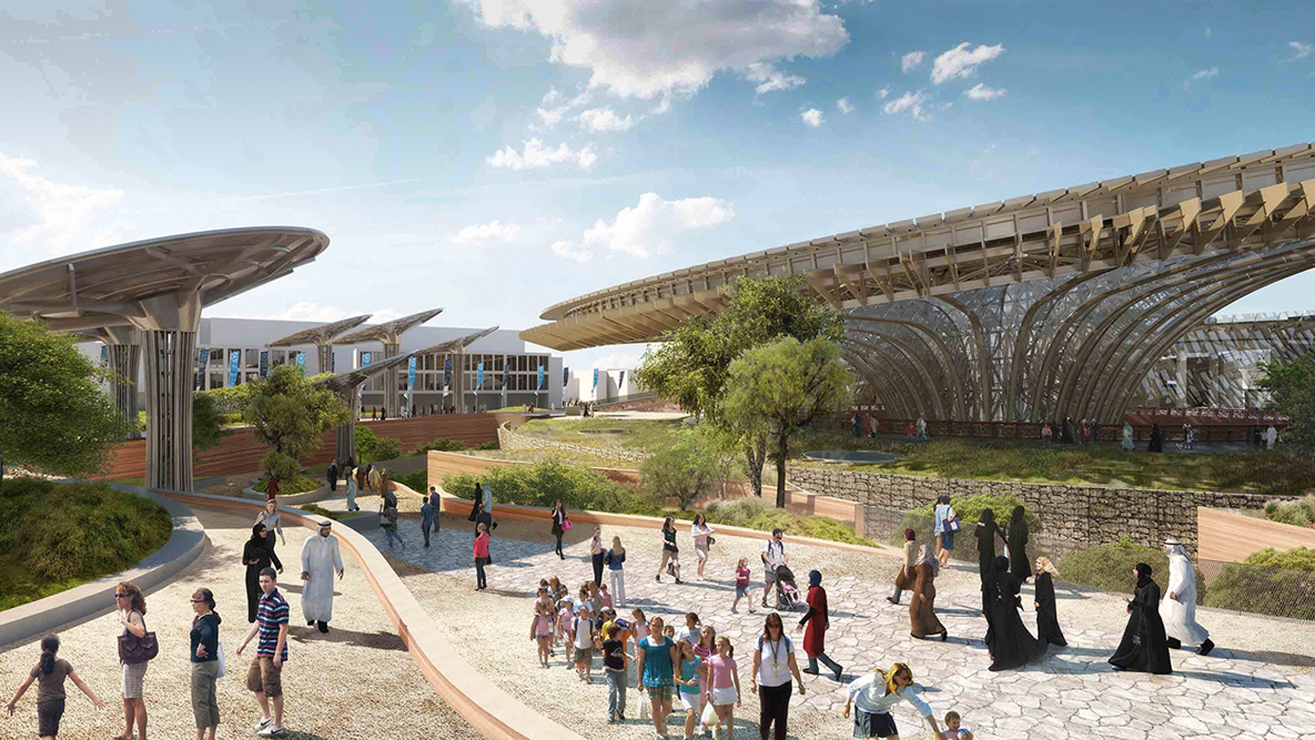 Ядром EXPO 2020 стануть три спільні павільйони, присвячені головним світовим трендам: мобільності (Mobility), можливостям (Opportunity) і сталому розвитку (Sustainability). Проєкти ключових будівель розроблені архітектурними монстрами: бюро Foster + Partners, BIG і Grimshaw Architects. Національний павільйон ОАЕ будується за проєктом Сантьяго Калатрави.