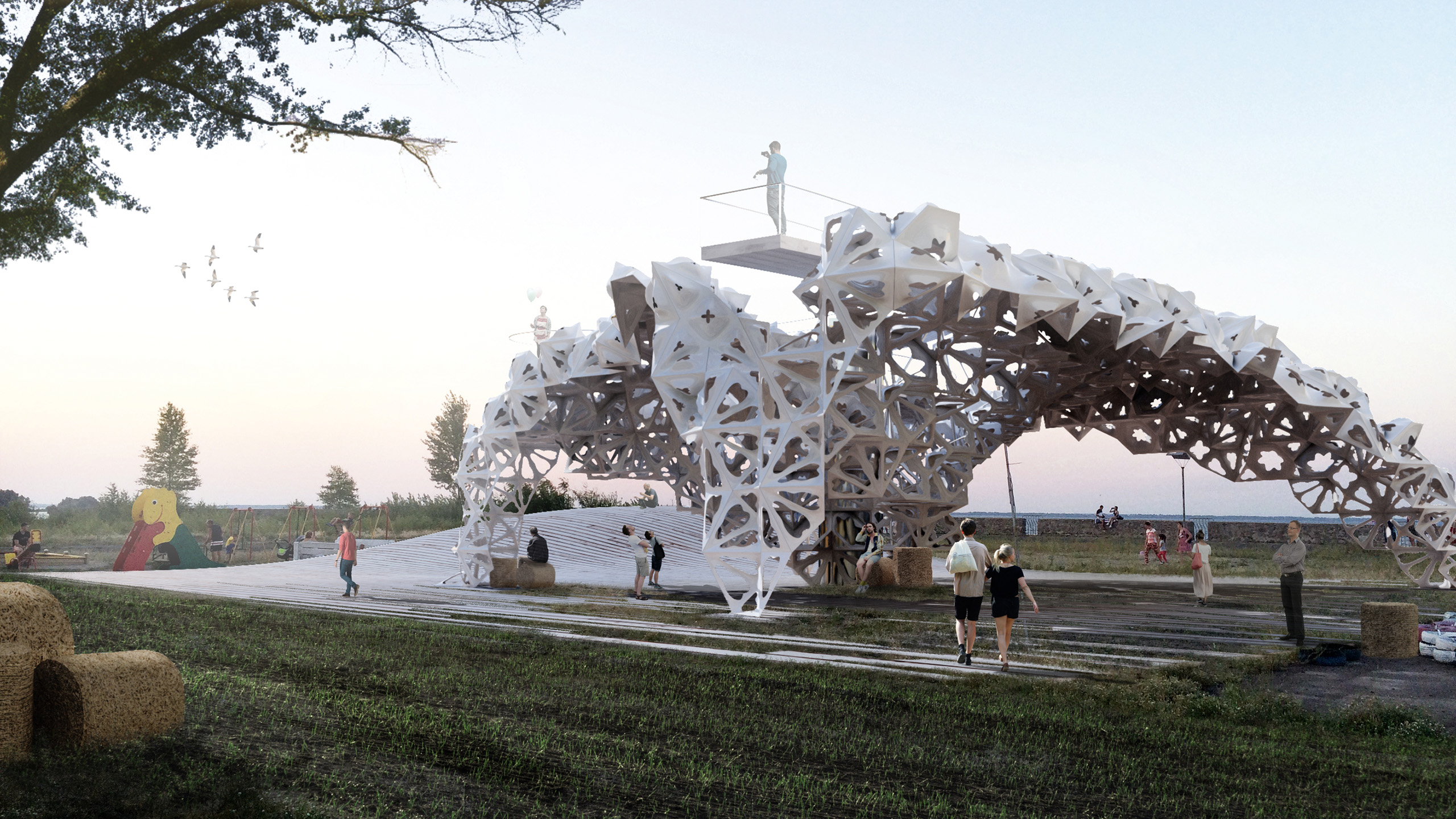 Ажурна та легка конструкція, яку розробили в Архітектурній майстерні «Дмитро Аранчій Architects» до EXPO 2015 у Мілані, мала символізувати прозорість і адаптивність. Джерело зображення: Архітектурна майстерня «Дмитро Аранчій Architects»