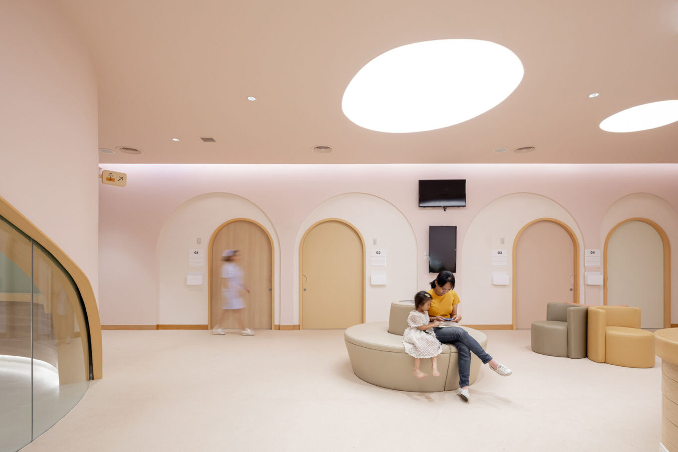 В. З.: Після курсів хімії чи радіології діти дуже сприйнятливі до кольору. Їхні очі чутливі, тому яскраві кольори можуть спровокувати різні реакції, аж до нудоти. Було завдання зробити тиху колористичну гаму, при цьому не забуваючи, що простори призначені насамперед для дітей. Вийшло, що форма дитяча, а палітра кольорів — швидше доросла.