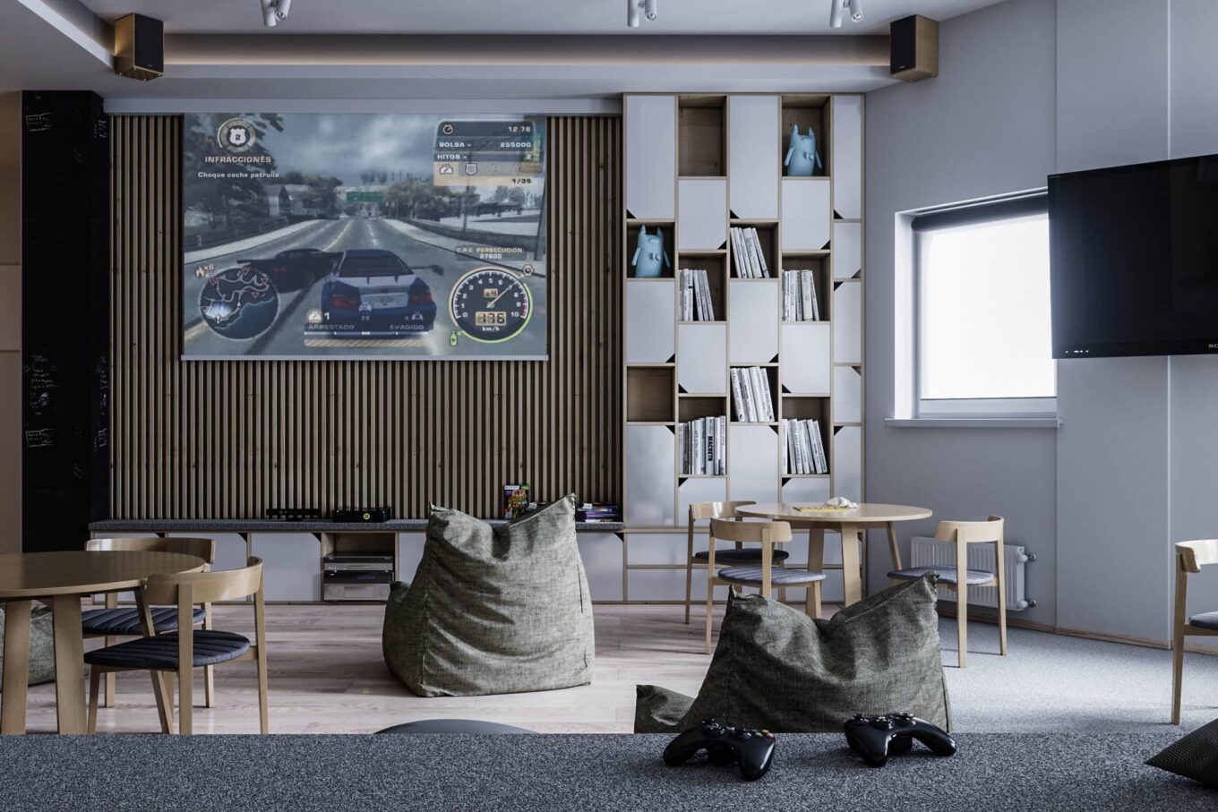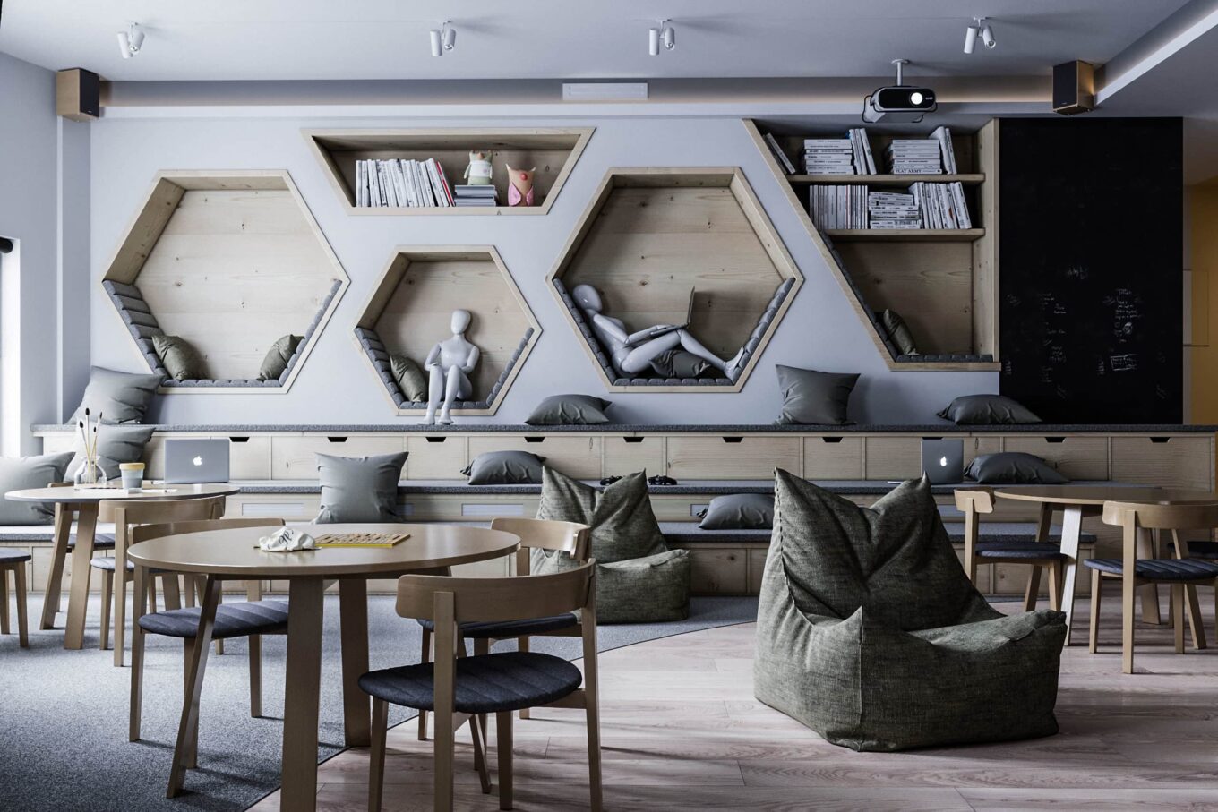 В. З.: У нас є дві зони: для дітей від 0 до 5–6 років і для підлітків. Діти першої групи воліють завжди грати разом — це факт, вони завжди гуртуються. А старші діти частіше вимагають усамітнення. Вони мають перехідний вік, іде процес формування особистості. Тому моєю ініціативою було передбачити зони для усамітнення — «комірки» для читання чи відпочинку. Щоб можна було сховатися від зовнішнього світу, але все ж таки бути частиною соціуму, не залишаючи ігрову зону.