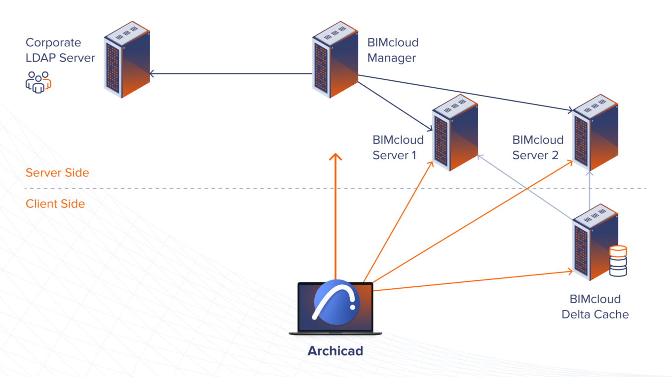 BIMcloud централізовано керується через BIMcloud Manager, браузерний інтерфейс котрого забезпечує централізоване керування серверами BIMcloud, delta-кешами BIMcloud і клієнтами Archicad
