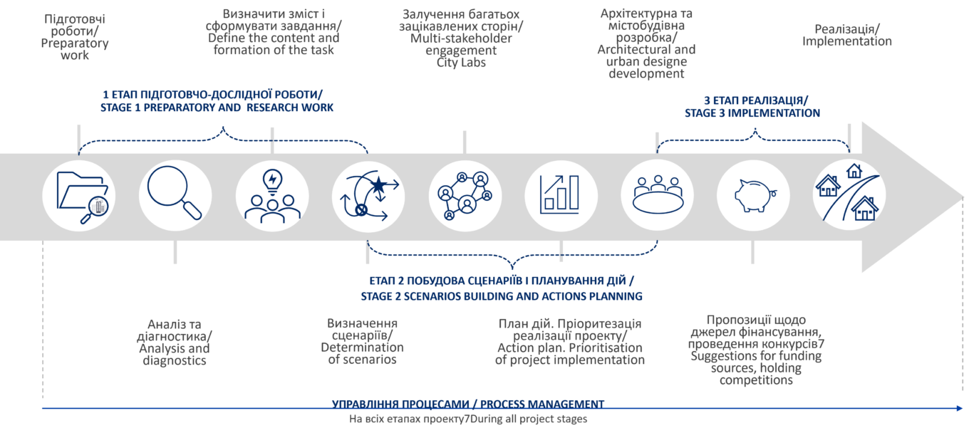 Використовуючи такий підхід, процес розробки програми відновлення міста, громади можна розділити на три етапи.