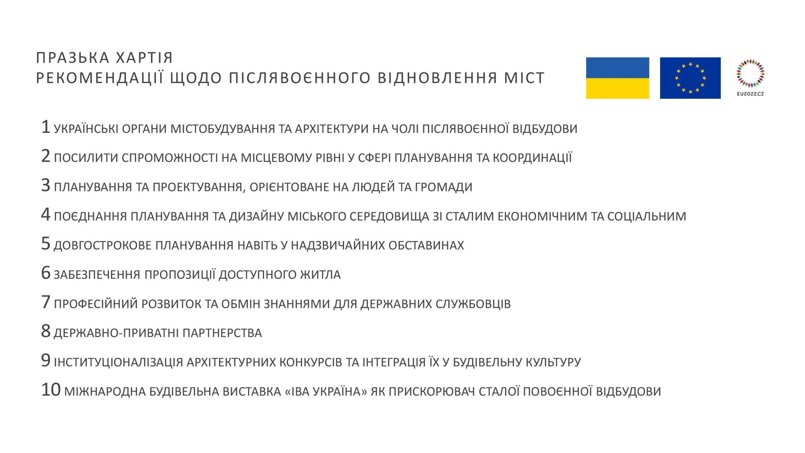 Успіх відновлення залежить від покращення та створення нової якості життя, підвищення спроможності місцевої влади, налагодження зв’язків, забезпечення кращої якості послуг. Основні пріоритети, досягнення яких є критерієм успіху відновлення, сформовані міжнародними та українськими експертами (Анна Бондар Верховна Рада України, Kees Christiaanse KCAP, Лідія Чижевська Національна спілка архітекторів України, Gyler Mydyti KCAP, Peter Navrat ONplan Lab, Otar Nemsadze GIZ Georgia & Tbilisi Architecture Biennale, Haris Piplas Drees & Sommer, Robert Youssef ONplan Lab) під час конференції в Празі.