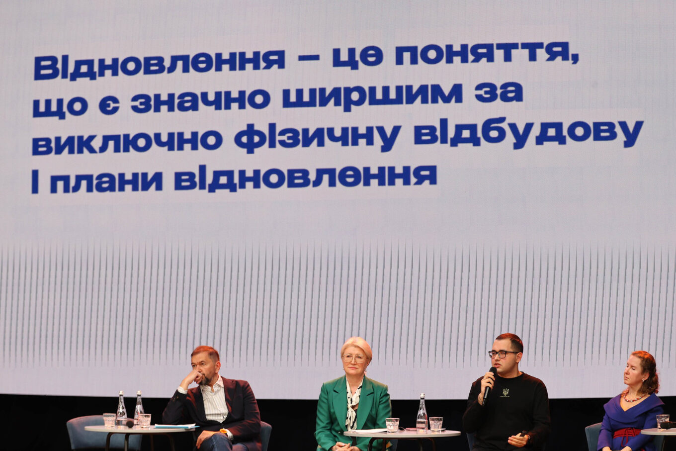 Дискусійна панель про екологічні засади відновлення: народний депутат, голова Комітету екології та природокористування Олег Бондаренко; адвокатка Галина Семенець; аналітик із залучення молоді та волонтерів ПРООН в Україні Дмитро Томенко; експертка з відновлення навколишнього середовища ПРООН Ольга Сютікова
