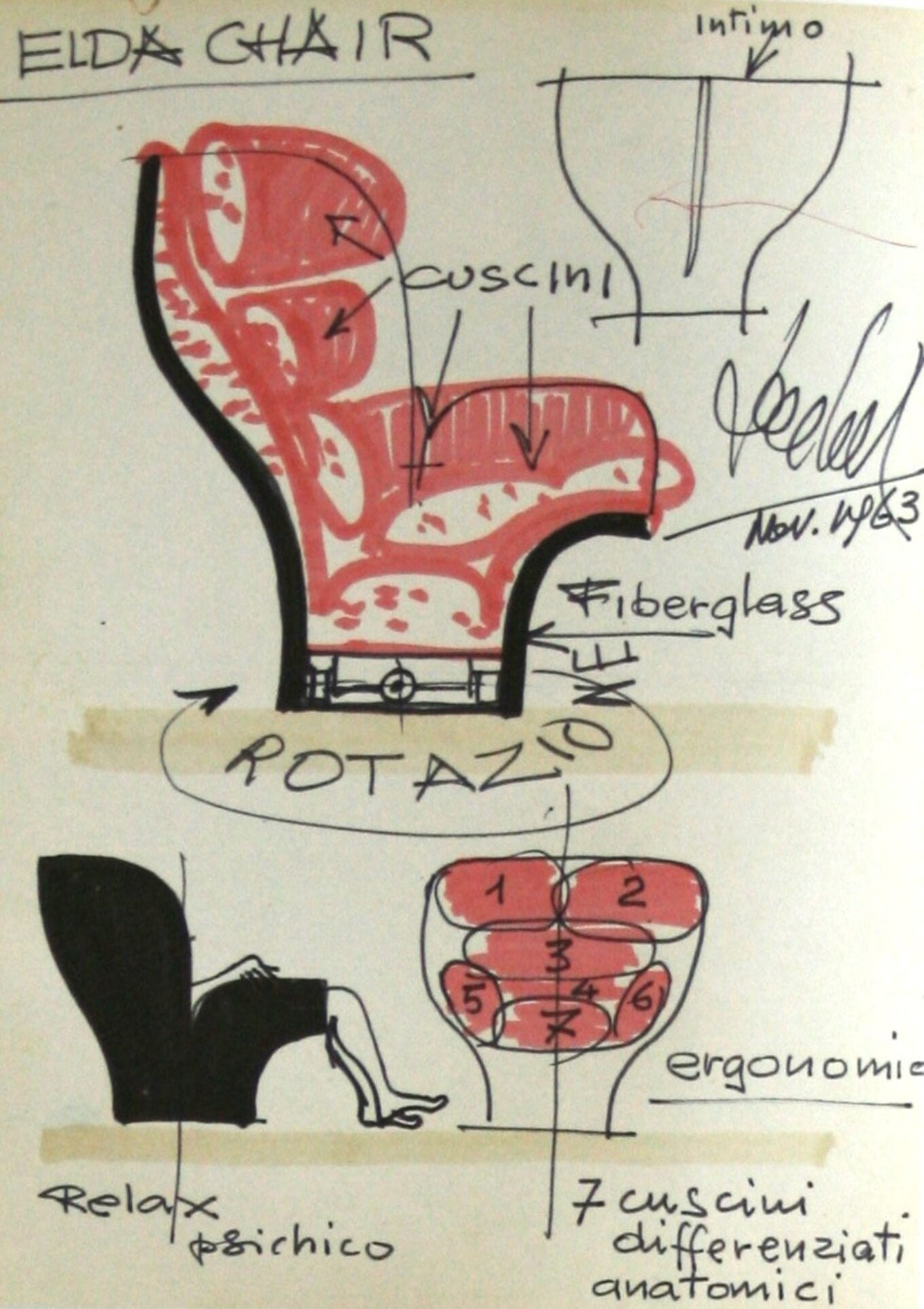 Однією з ікон творчості Коломбо вважається крісло Elda. Він назвав його на честь дружини і часто у ньому фотографувався зі своєю улюбленою люлькою. Тоді в 1963 році це був найбільший предмет зі склопластику. Він і зараз має футуристичний вигляд, а його подушки характерної форми, що підтримують ергономічність, зненацька викликають у пам’яті ілюстрації з підручника з анатомії, де зображений кишечник.